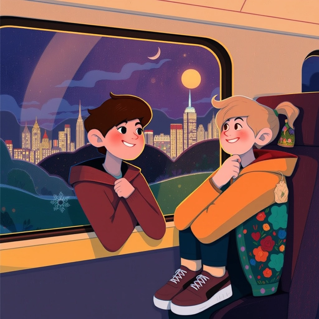 As the train pulled away from the station, [Emory](343Z9DFF) and [Liv](6VGHXQRX) waved goodbye to the city that sparkled like a dream. They knew this was a trip they’d cherish forever.