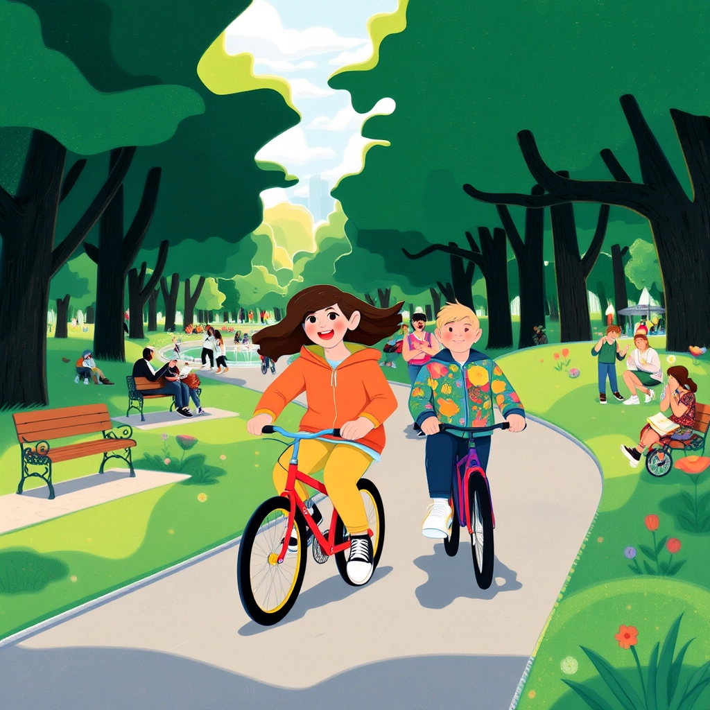 After the zoo, they rented bikes to explore more of Central Park. The park felt like a peaceful escape from the busy city, with green grass, towering trees, and sparkling ponds.