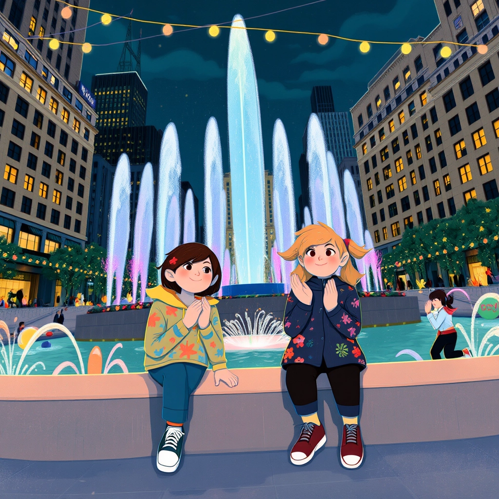 To cap their day, they watched a sparkling fountain show at Rockefeller Center. The fountains danced to music, creating rainbows in the lights as the crowd cheered.