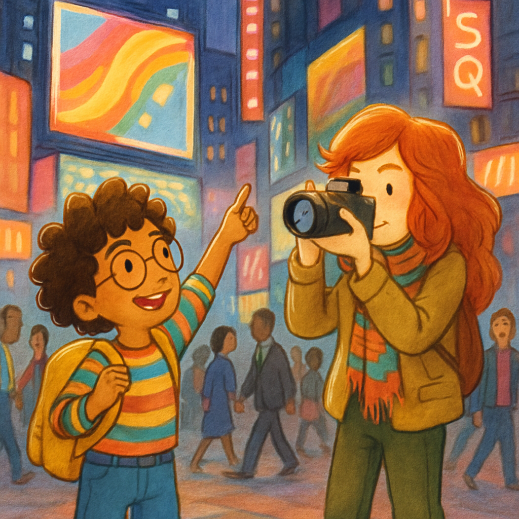 Their first stop was Times Square. The bright lights and giant screens dazzled them as people rushed by. 'It’s like a big, glowing puzzle!' [Emory](3M36VV69) laughed, and [Liv](KRPWPQQV) nodded, taking a picture of the giant billboards.