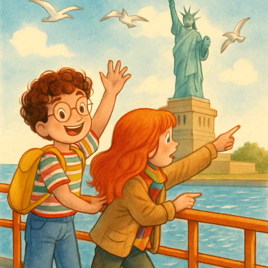 After lunch, they visited the Statue of Liberty. From the ferry, they could see the statue standing tall and majestic, and [Emory](3M36VV69) waved as if Lady Liberty could see them.