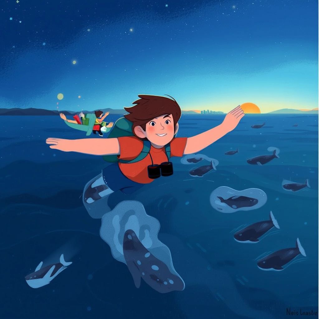 Flying over cities, oceans, and mountains, [Emory](LKHLQJZS) and his friends shared stories and laughter. They even spotted whales in the ocean and bustling streets in the cities below.