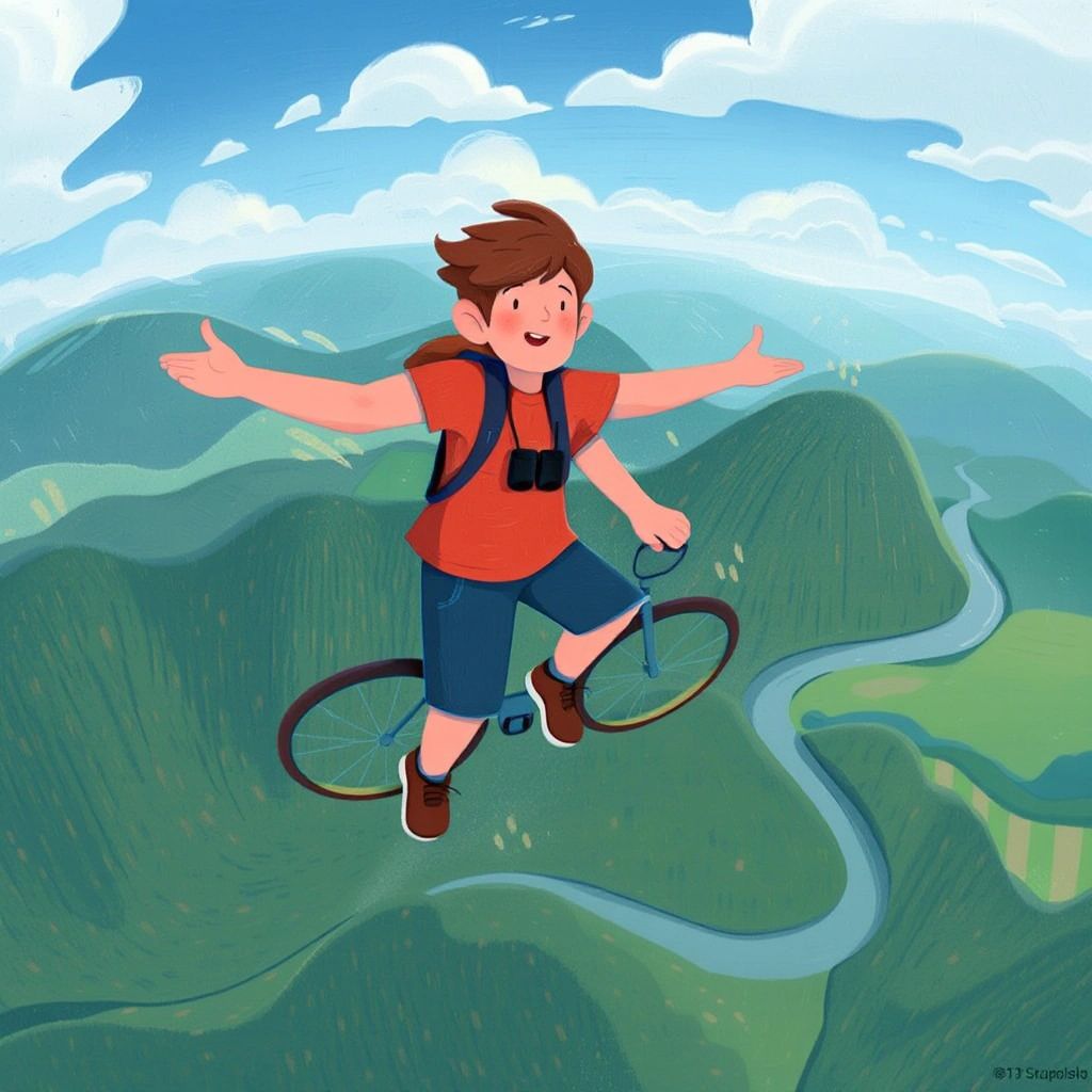 As he flew higher, he could see the world spread out beneath him—the rolling hills, sparkling rivers, and patchwork fields. 'I need to see more!' he thought, steering the bicycle towards the distant mountains.