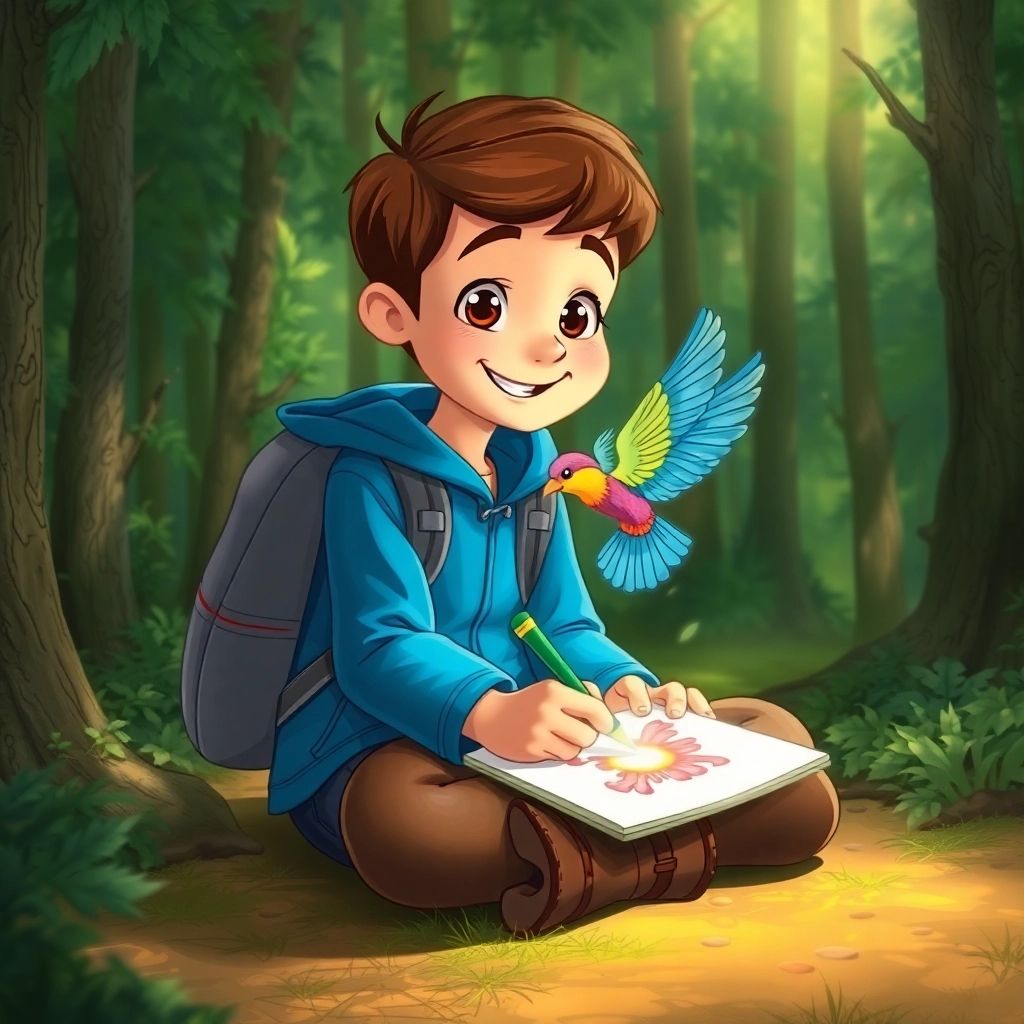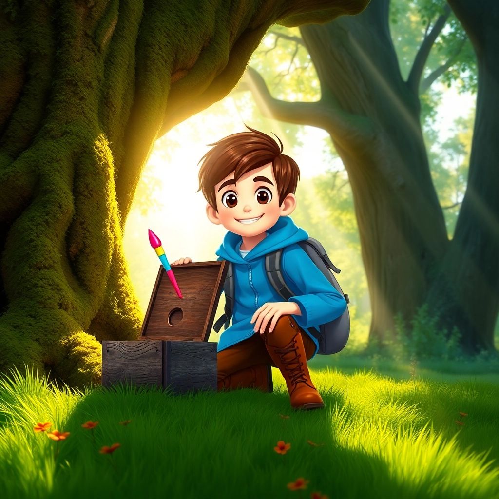 One sunny morning, [Emory](RMJS3KH4) was exploring the forest near his home. With his trusty gray backpack and big adventurous smile, he stumbled upon an old wooden box tucked beneath a mossy oak tree. "What could this be?" he wondered aloud. When he opened it, he found a paintbrush that shimmered in the sunlight, its bristles glowing with all the colors of the rainbow.