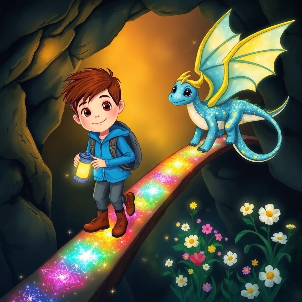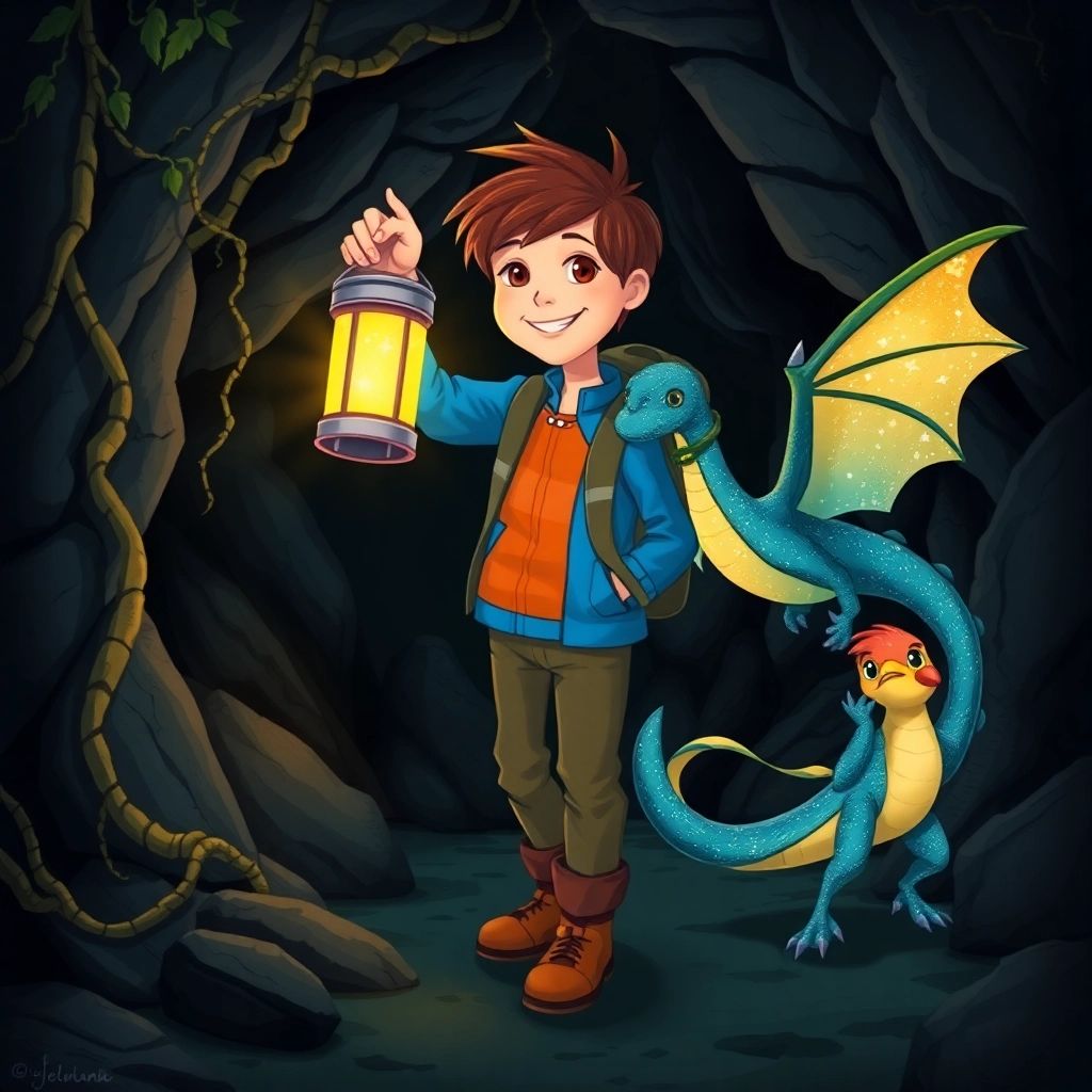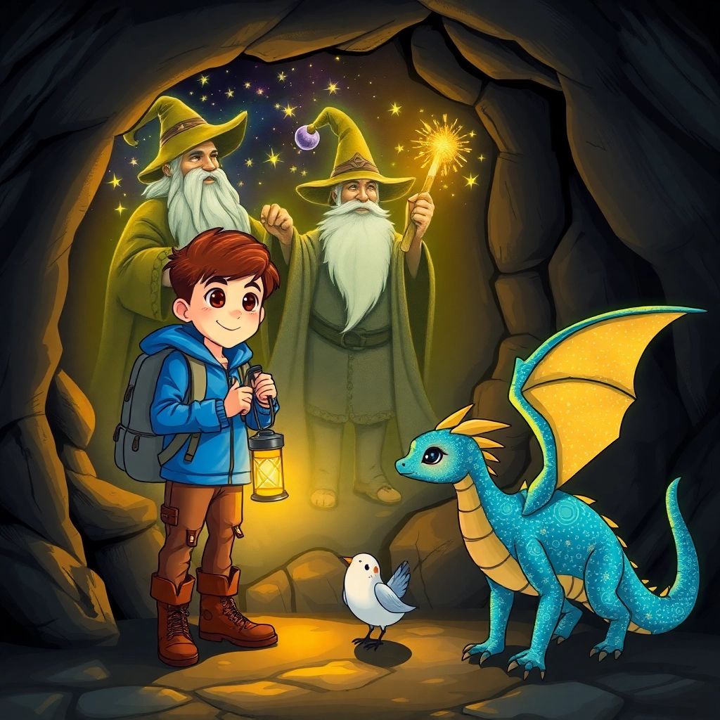Together, [Emory](RMJS3KH4), [Sparklewing](4GMBYBH4), and the colorful bird explored the magical forest. When they came across a dark, shadowy cave, [Emory](RMJS3KH4) painted a glowing lantern to light their way. He clutched the lantern tightly as they stepped inside the cave, their shadows dancing on the walls.