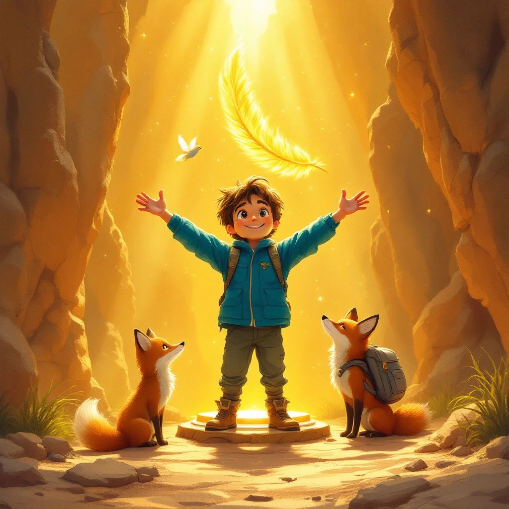 Finally, [Emory](RMJS3KH4), the fox, and Melody (who had returned to help) arrived at a golden canyon. The shining feather floated on a pedestal in the center. Suddenly, a gust of wind began spinning around them! "The wind spirit guards the feather," Melody whispered. "We have to prove we’re kind and brave." Without hesitation, [Emory](RMJS3KH4) stood tall. "We’re here to make a wish to help others!" The wind grew calm, and the feather gently floated into [Emory](RMJS3KH4)’s hands.