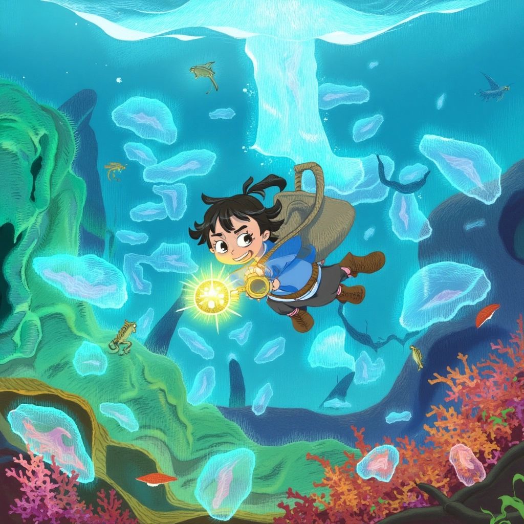 Determined to follow the compass' direction, [Emory](RMJS3KH4) prepared for an underwater adventure. He wore his best waterproof jacket and goggles, and slid into the ocean with his small gray backpack. The compass glowed brighter underwater, guiding him past vibrant coral reefs and schools of curious fish.