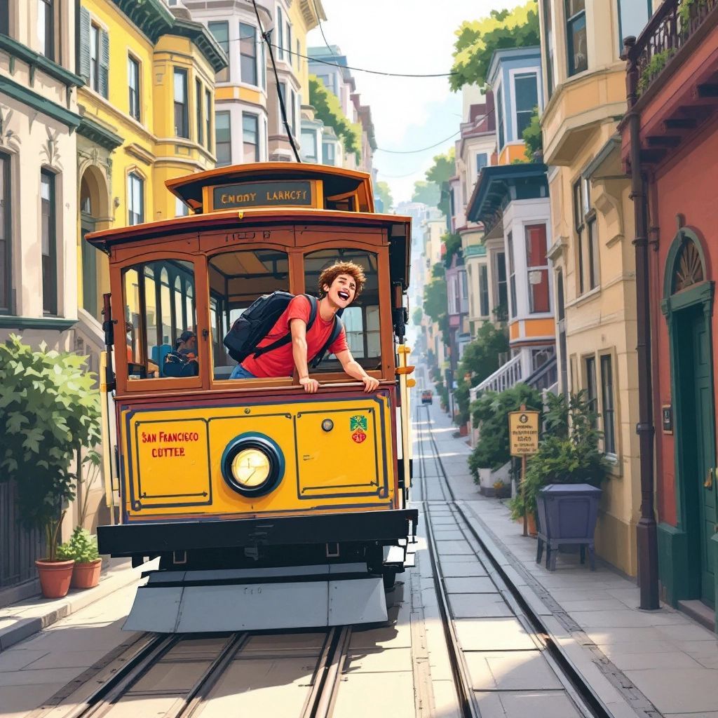 [Emory](LKHLQJZS) hopped on a famous San Francisco cable car. He felt the breeze in his hair as the car rattled up the steep streets, and he waved to the friendly people he passed by.