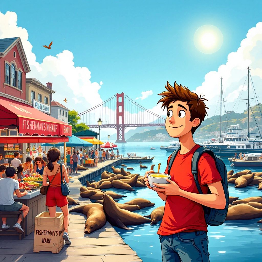 Next, [Emory](LKHLQJZS) visited the lively Fisherman’s Wharf, where sea lions barked and boats bobbed in the harbor. He tasted delicious clam chowder served in a warm, sourdough bowl.