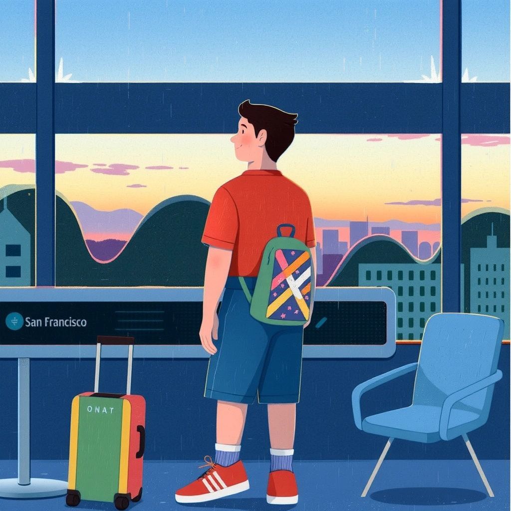 [Emory](LKHLQJZS) was buzzing with excitement as he boarded the plane to San Francisco. It was his first time visiting the bustling city. With his trusty backpack, he was ready for an adventure.