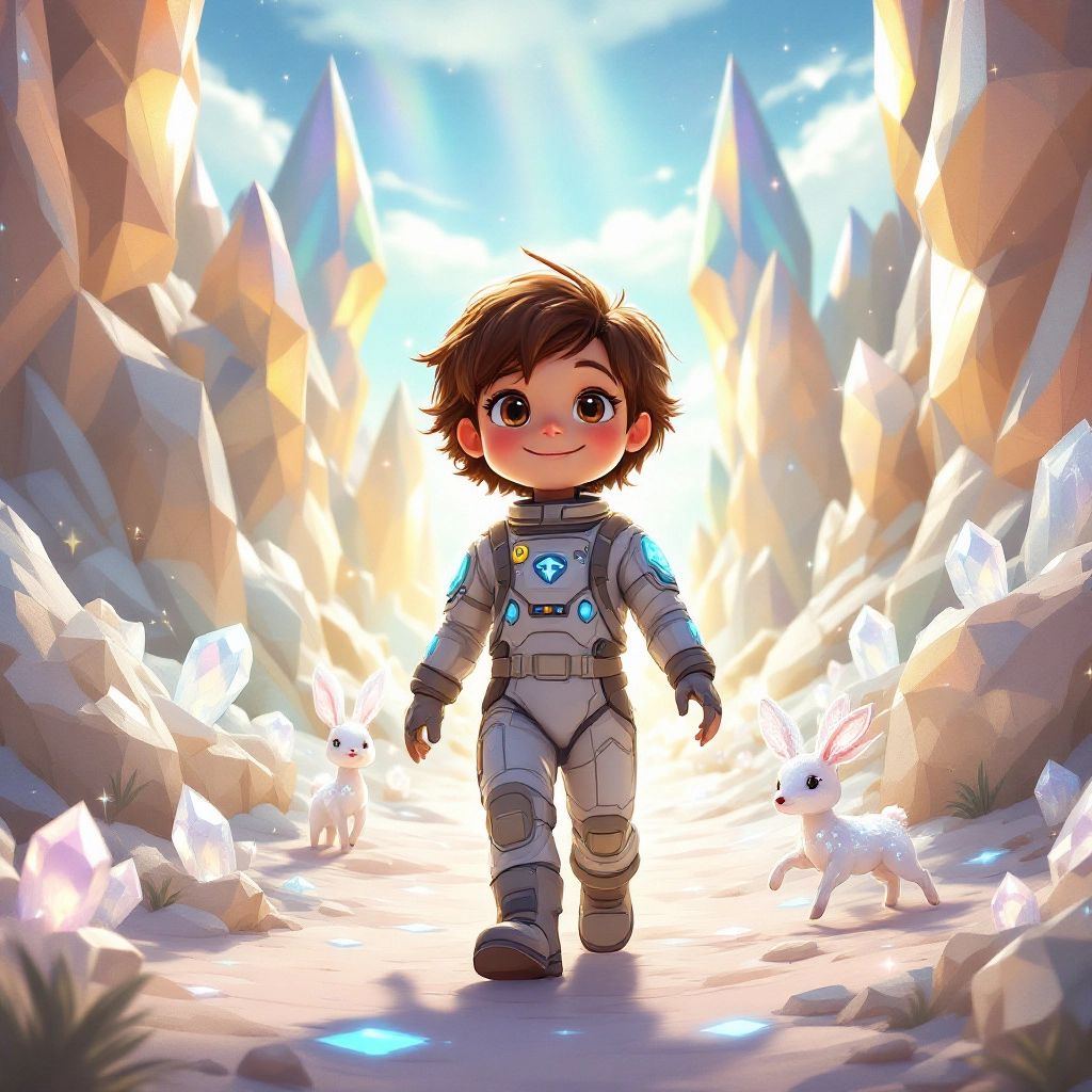 Next stop was the Crystal Cove, a sparkling planet shaped like a giant diamond. Great crystal towers stretched into a mint-green sky. In the caves below, glowing crystal creatures danced and hummed a magical tune. "Welcome, Explorer," they chimed.