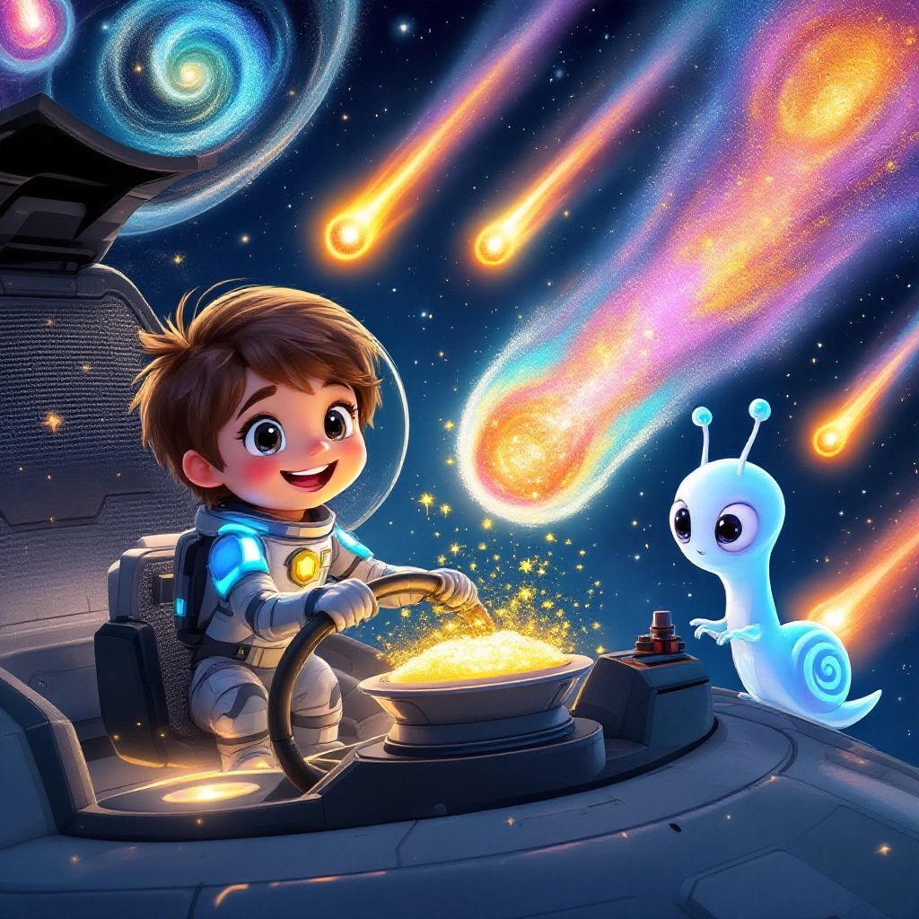 Their final stop was Colorful Comet Catch, a looping belt of comets with glowing tails. [Emory](S6NVDP3J) skillfully piloted Star Skipper through the belt, gathering comet dust to share back on Earth. [Emory](S6NVDP3J) felt proud of her discoveries and new friend!