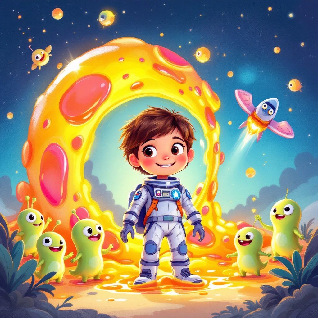 The first planet [Emory](S6NVDP3J) found was Giggly Gooey! It was made entirely of bouncing jelly. As her ship landed, the surface wobbled like a giant bowl of jello. Friendly jelly creatures waved at her, giggling as they hopped.