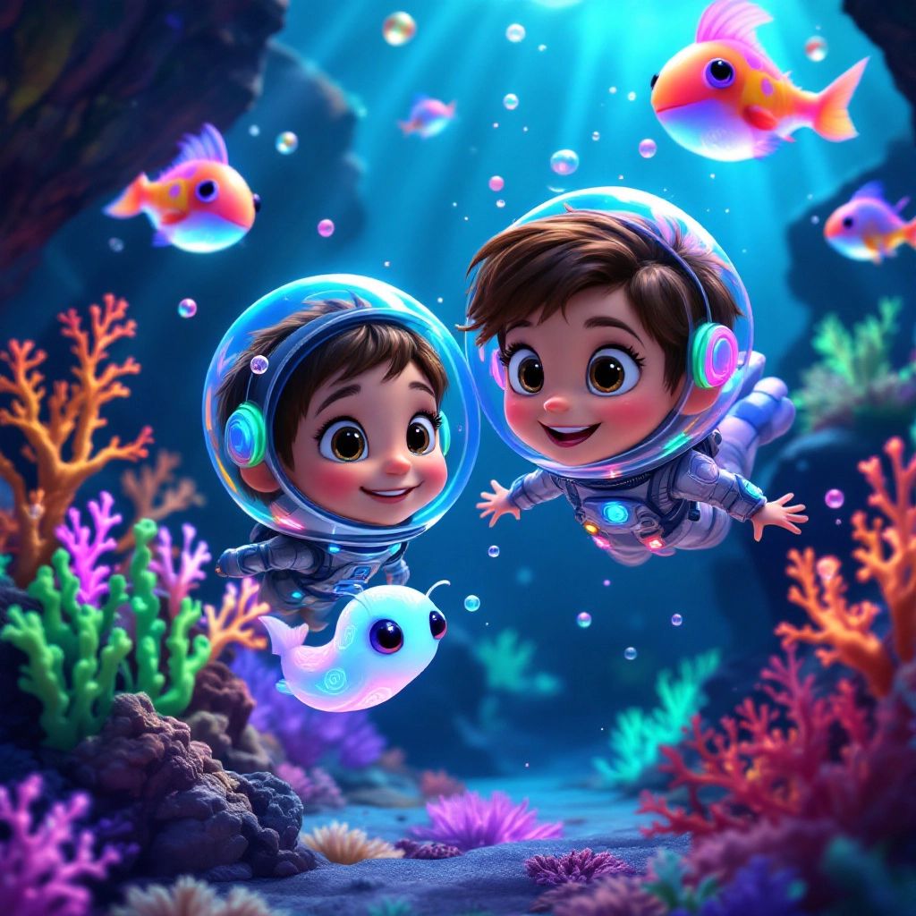 From there, they floated on to Rainbow Reef, a water-filled planet with colorful coral that glowed like rainbow fireworks. [Emory](S6NVDP3J) and [Snizzle](S2CNGTP2) donned their underwater gear and swam alongside glowing fish aliens!