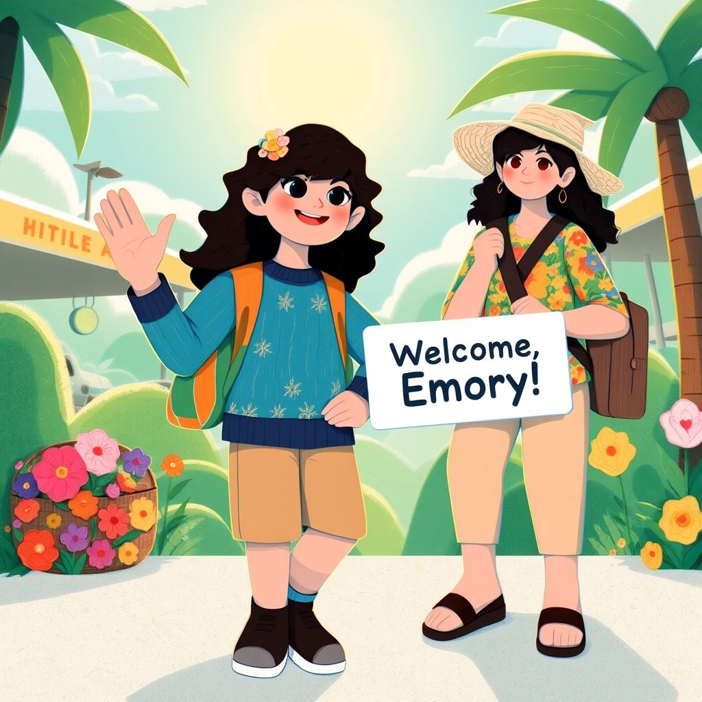 As [Emory](KLX2WFQS) stepped off the plane, a gentle breeze greeted them. The scent of saltwater mixed with the fragrance of flowers filled the air. Waiting for [Emory](KLX2WFQS) was [Mimi](DCFZY4FK), a friendly local guide who smiled brightly and held a sign that read 'Welcome, [Emory](KLX2WFQS)!'