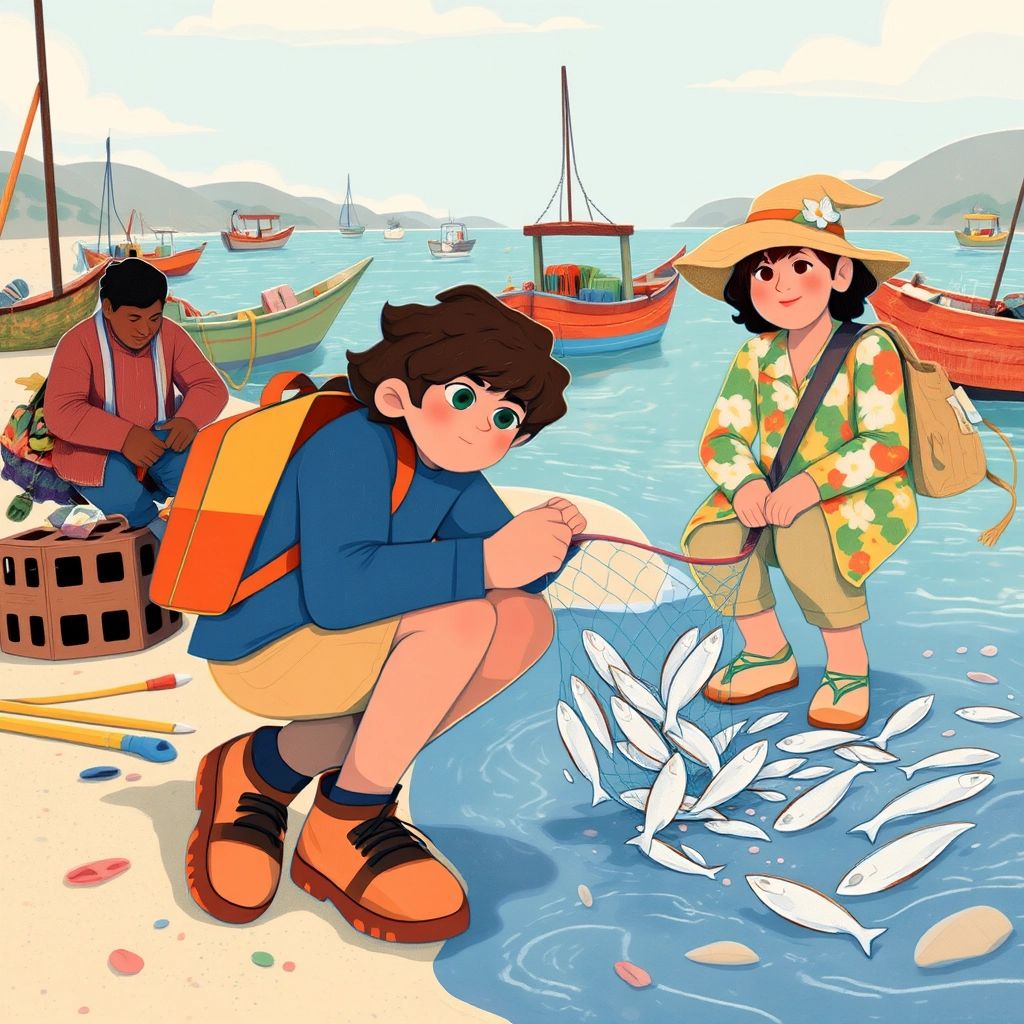 Soon, [Mimi](DCFZY4FK) took [Emory](KLX2WFQS) to a seaside village where fishermen were mending their nets. 'In Madeira, fishing is important!' [Mimi](DCFZY4FK) said. The fishermen shared stories of the ocean while [Emory](KLX2WFQS) helped pull in a small net full of shiny fish.