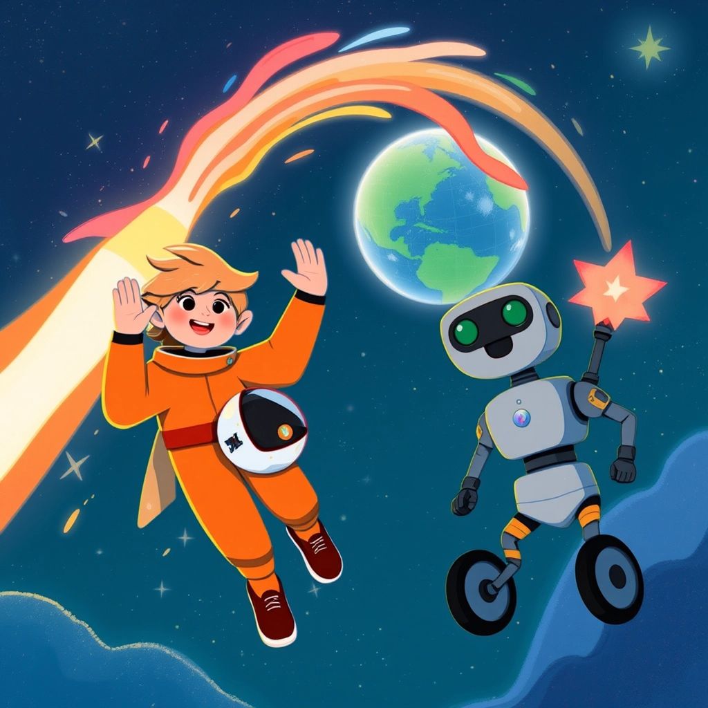 As [Emory](HL2RP9VF)’s rocket soared back to Earth, he looked at the starrock glowing in his hand. 'I’ll never forget this amazing adventure,' he said. [Spark](RT7MVB2L) beeped, 'MISSION SUCCESS!'
