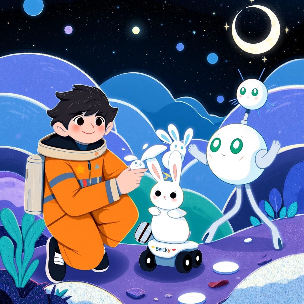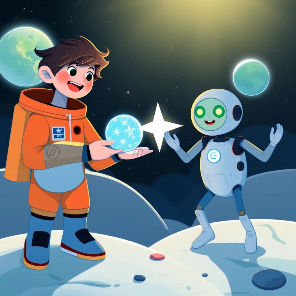 Finally, they arrived! The Moon’s surface sparkled with silvery dust under a dark sky filled with stars. 'Welcome, Visitor [Emory](HL2RP9VF)!' said [Luna](QRFL9HY9), the Moon Ambassador, a friendly moon-shaped robot with a twinkling smile.