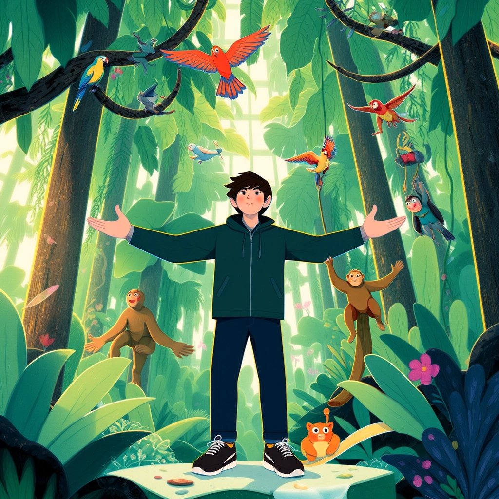 In the Rainforest Zone, [Emory](BCSGJQWB) felt as though he’d entered a jungle as colorful parrots flitted above and monkeys swung from branch to branch.