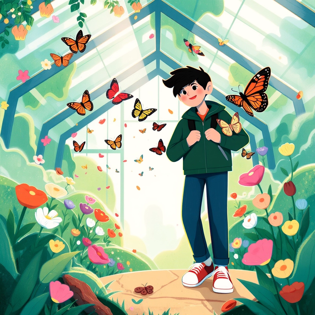 In the Butterfly House, colorful butterflies floated all around [Emory](BCSGJQWB), landing gently on his green jacket.