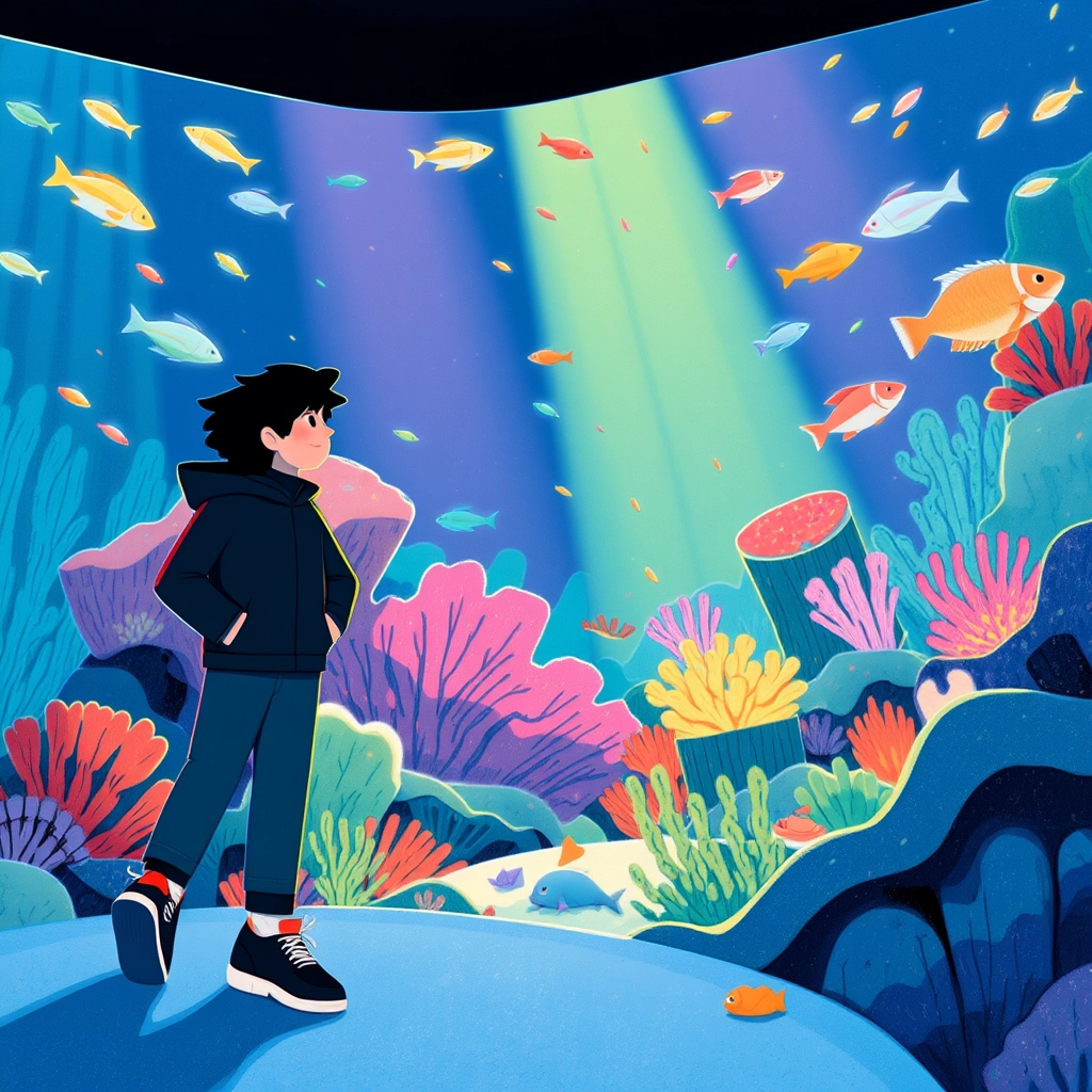 At the Aquarium, [Emory](BCSGJQWB) watched colorful fish dart between coral reefs, looking like living rainbows in the water.
