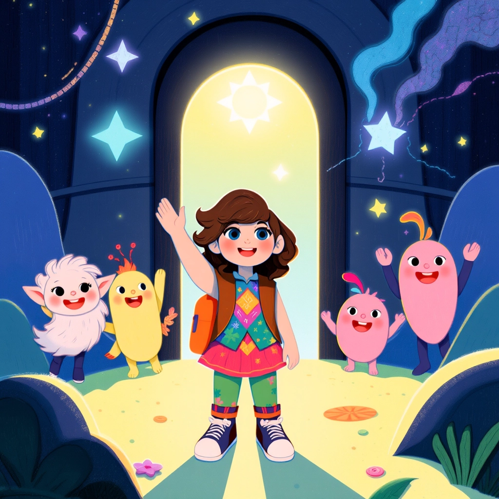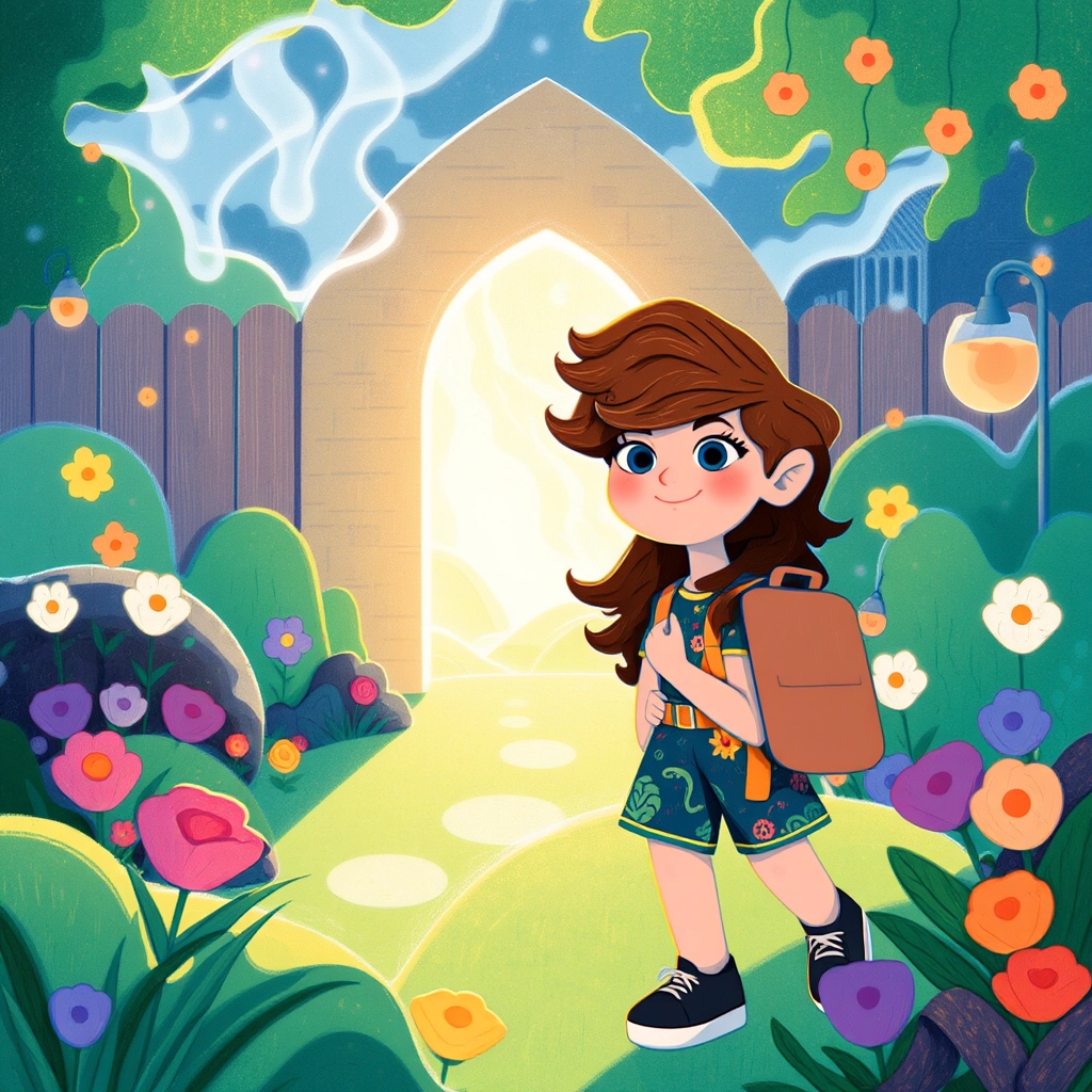 One sunny morning, [Clara](MNXDK64J), the adventurous girl with sparkling blue eyes and curly hair, discovered a mysterious glowing doorway in her backyard. Slowly, she stepped through it, her heart beating with excitement and curiosity.