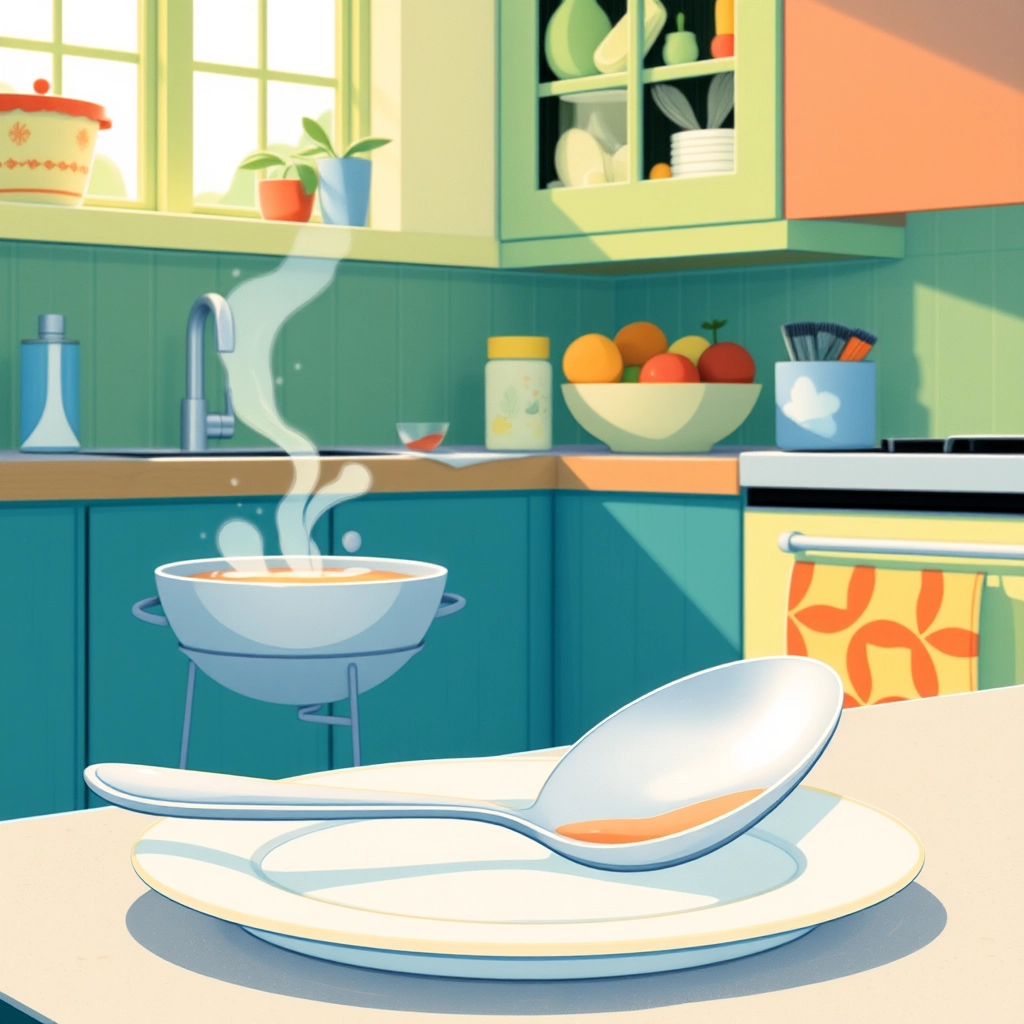 Let’s go to the kitchen. Here's a spoon! In English, we say 'spoon'.