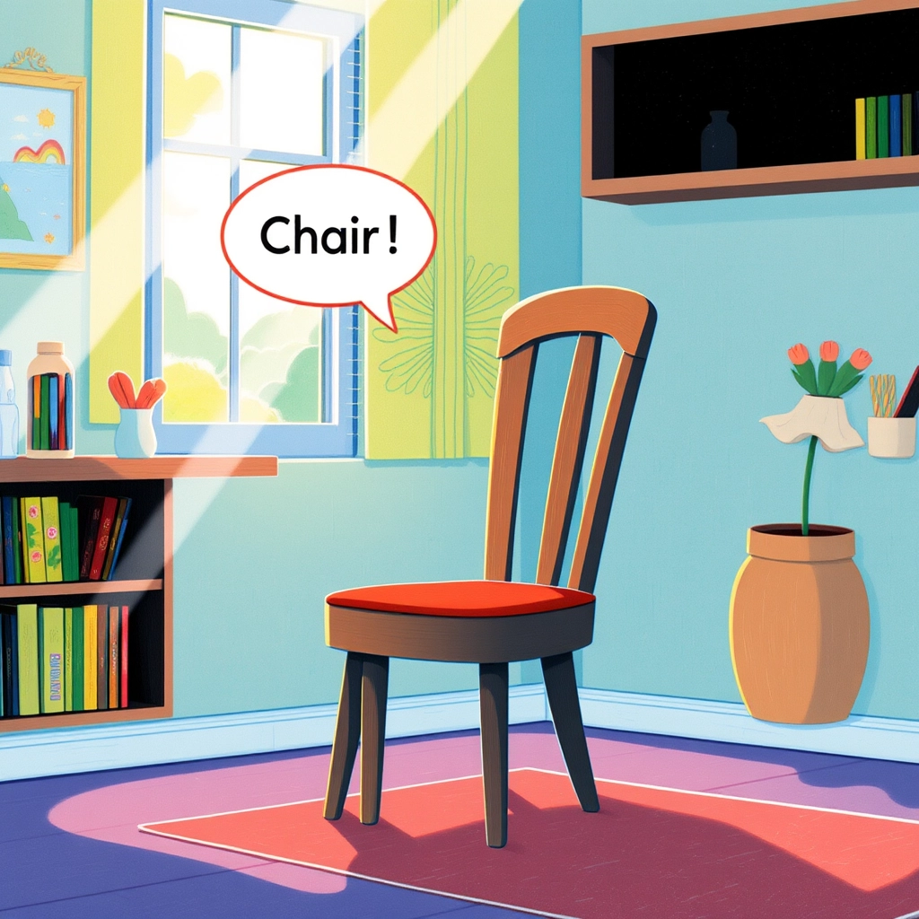 This is a chair. We say 'chair' in English! Can you find a chair in your home?