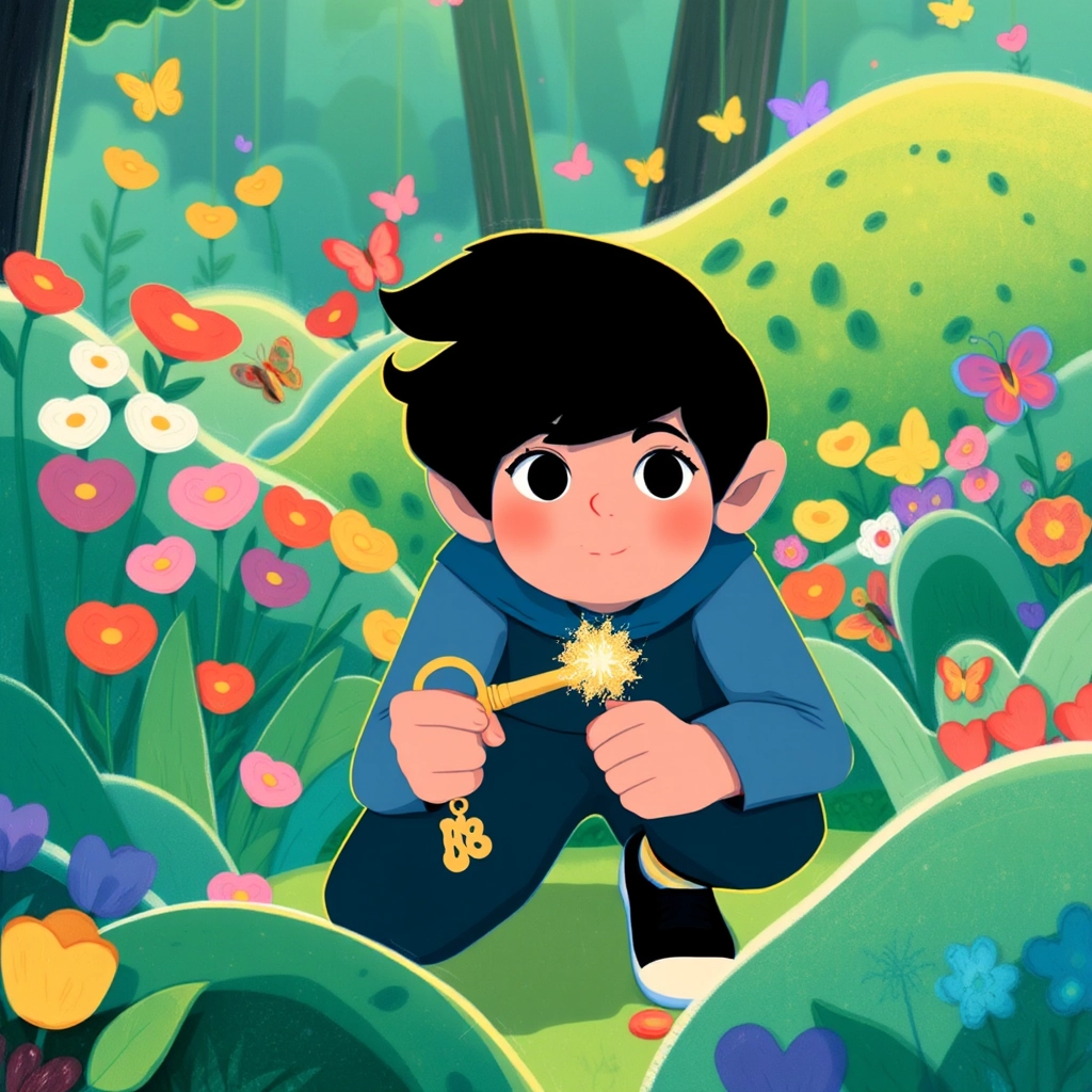 One day, while exploring his garden, Evan found a tiny golden key hidden under the bushes. It sparkled in the sunlight, making him wonder, 'What could this key open?'