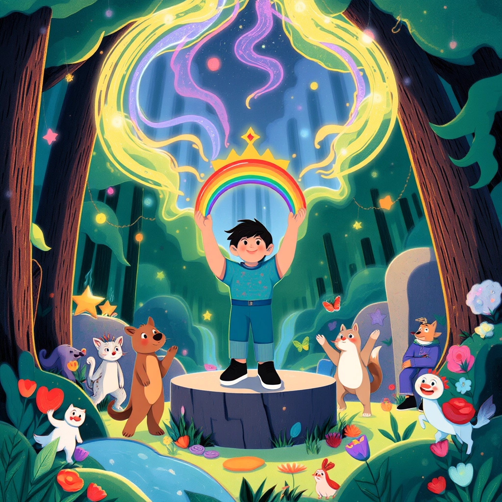 Evan placed the crown back in its rightful spot, and the enchanted forest bloomed in bright, stunning colors once again. All the animals cheered, 'Thank you, Evan—you’re our hero!'