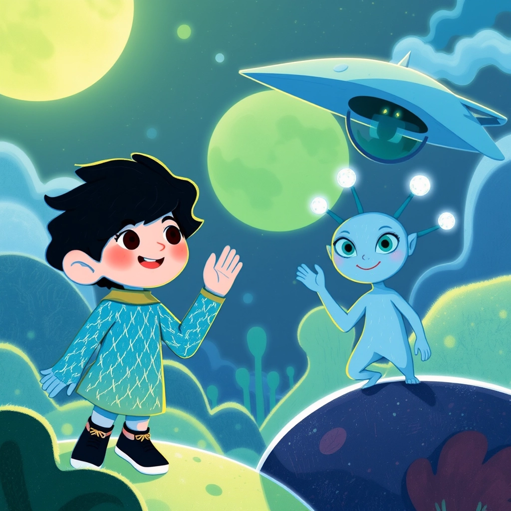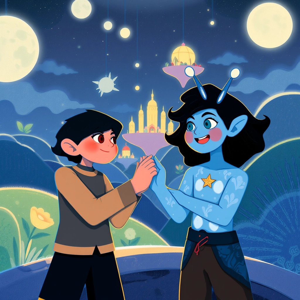 On a distant green moon, [Alae](LMRQHJ35) landed and met a curious alien boy, [Rivoxo](RRD3R3H7). [Rivoxo](RRD3R3H7) had blue skin, turquoise eyes, and six tiny antennas on his head. 'Who are you?' asked [Rivoxo](RRD3R3H7), tilting his head.