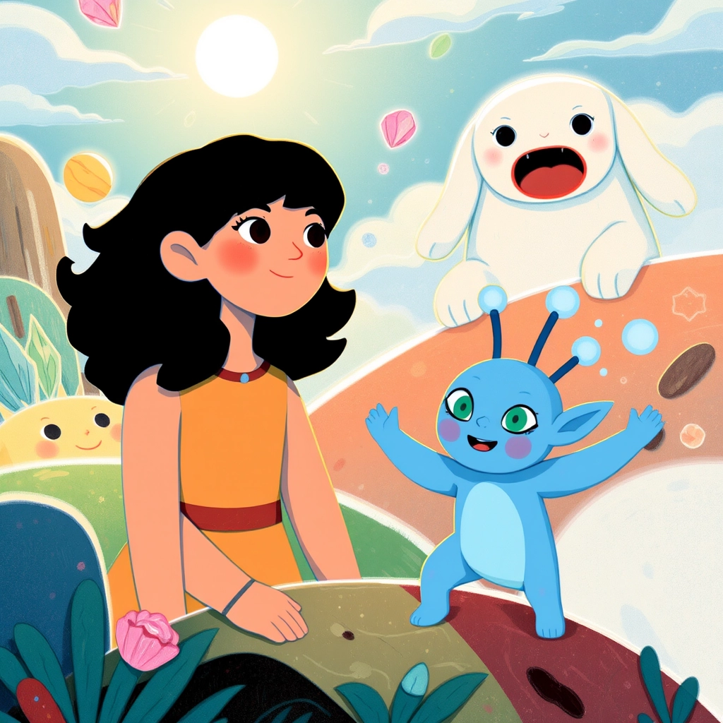 Together, [Alae](LMRQHJ35) and [Rivoxo](RRD3R3H7) journeyed to new planets. On Crystalus, they befriended glittering crystal beings. On Flufforia, giant fuzzy creatures joined their mission, cheering happily.
