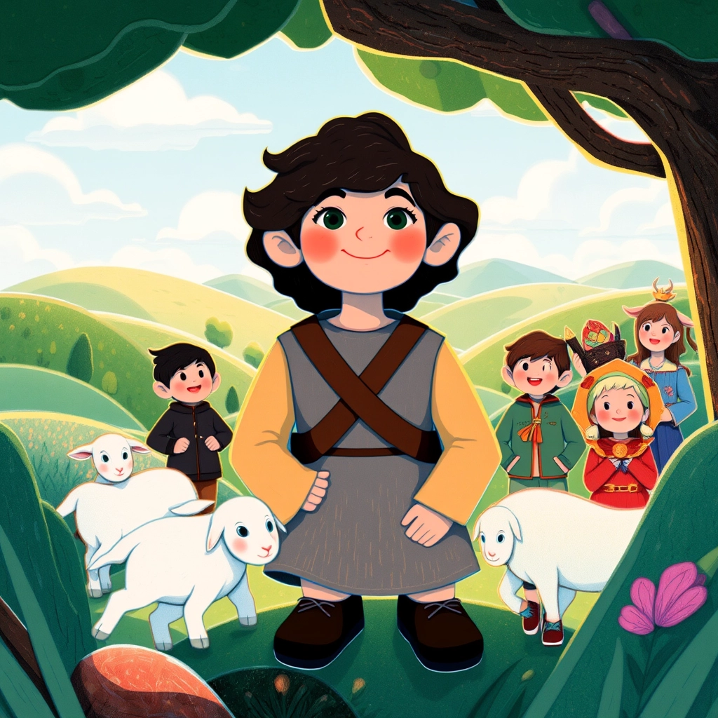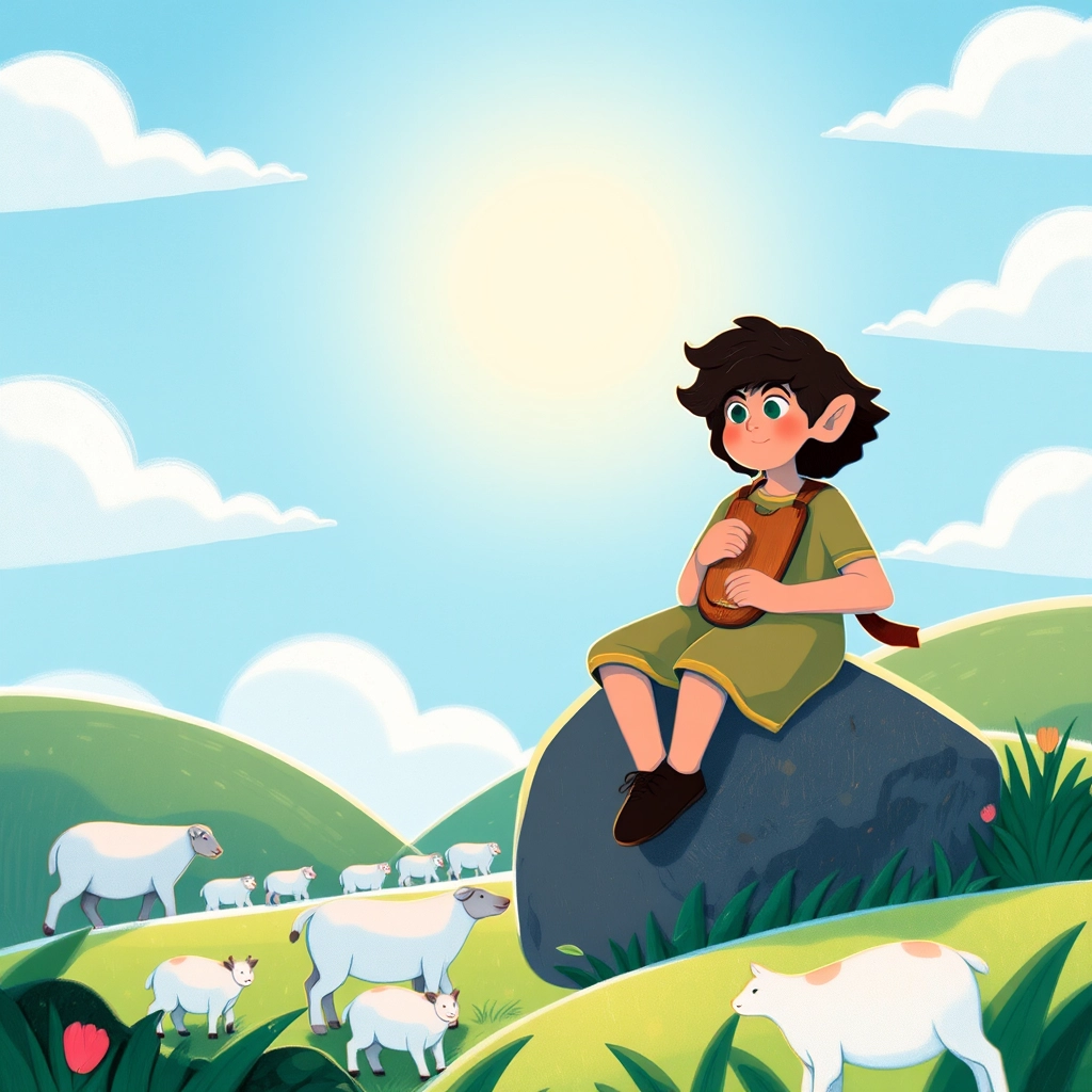 [David](K2YP73FJ) was a young shepherd boy who loved tending to his father's sheep in the hills of Israel. Each day, the sun warmed his skin, and the gentle breeze carried the songs of birds. He trusted God to protect him and often sang songs of praise while watching over the flock.