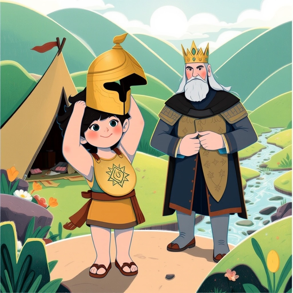 [King Saul](B7DMCZFZ) offered [David](K2YP73FJ) his royal armor, but it was too heavy. "I can't fight in this," [David](K2YP73FJ) said as he took it off. Instead, he picked up his trusted sling and went to find smooth stones from a nearby brook.