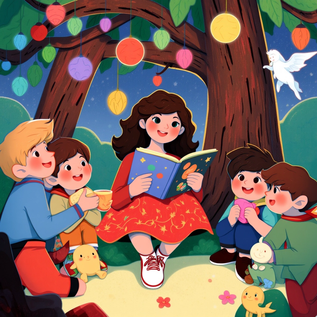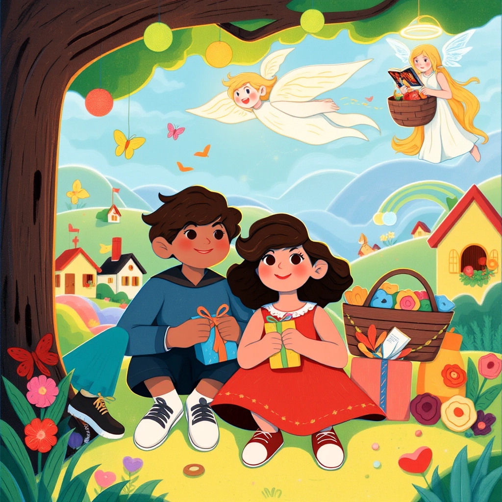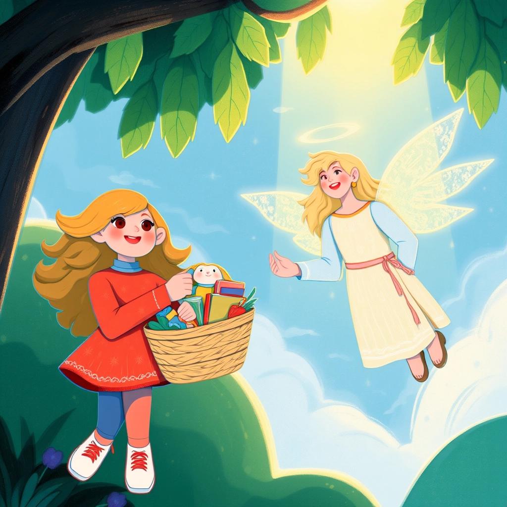 One sunny afternoon, as [Feli](7ST6MLDP) sat under her tree, a glowing light appeared above her. To her amazement, it was a magical angel with shimmering golden wings!