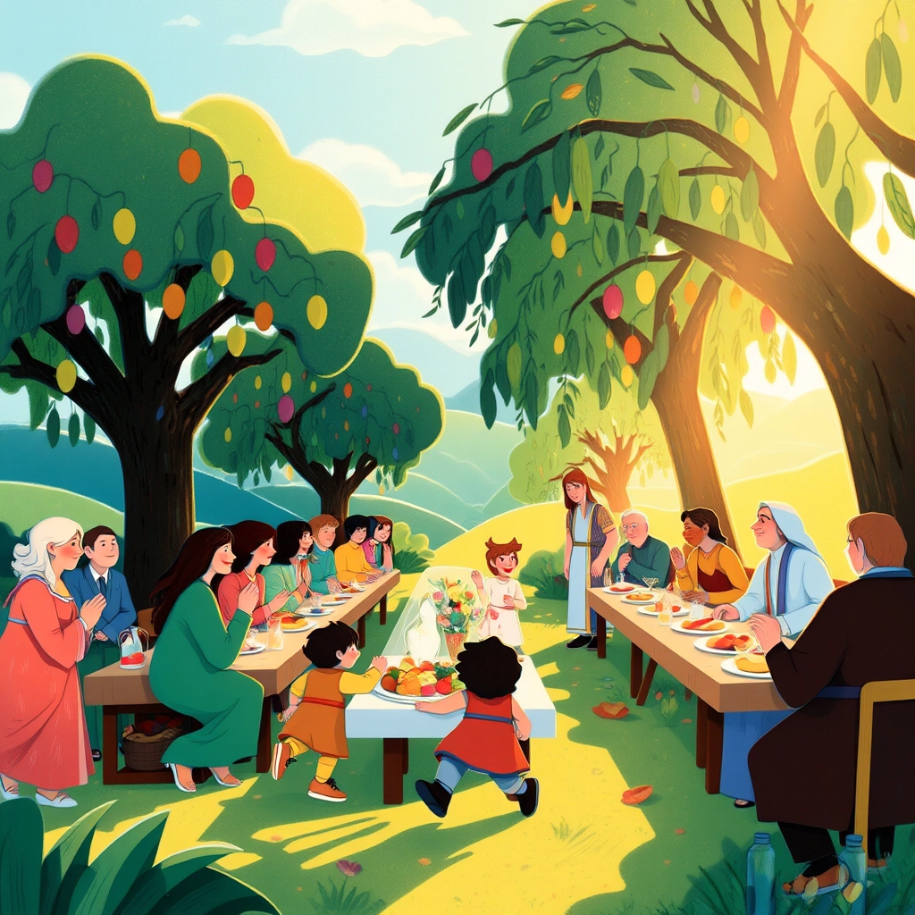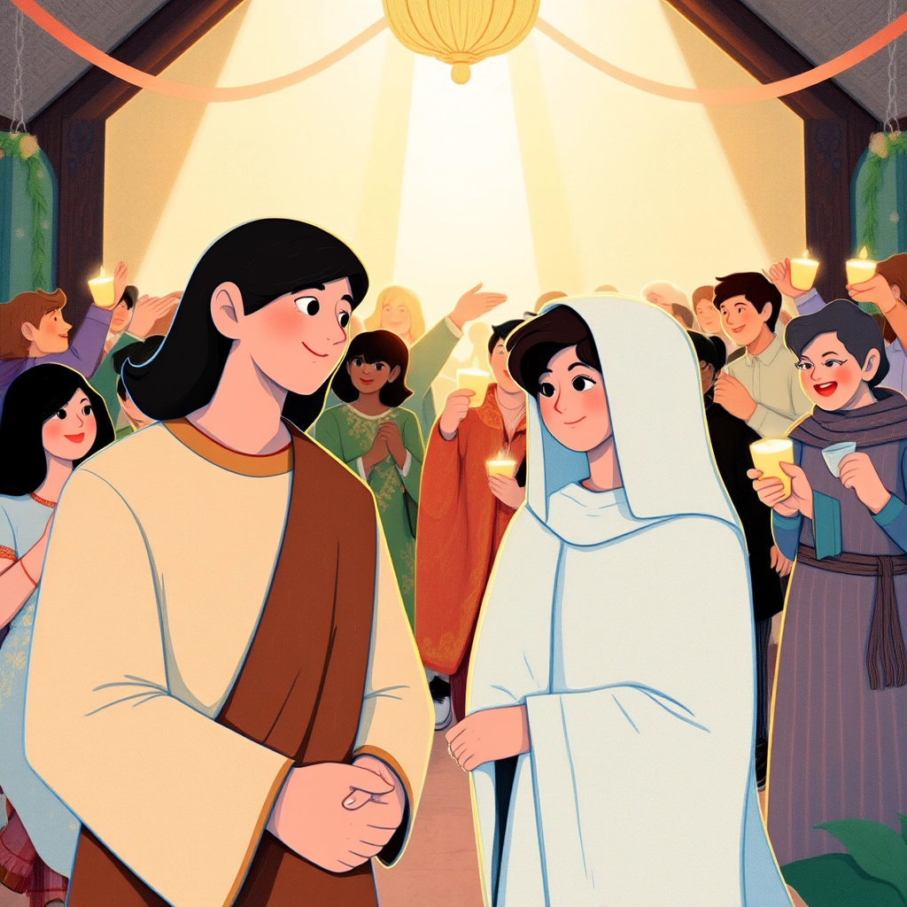 In the sunny town of Cana, everyone was excited for the big wedding celebration. Families and friends gathered, laughter echoed in the air, and delicious food and drinks were everywhere!