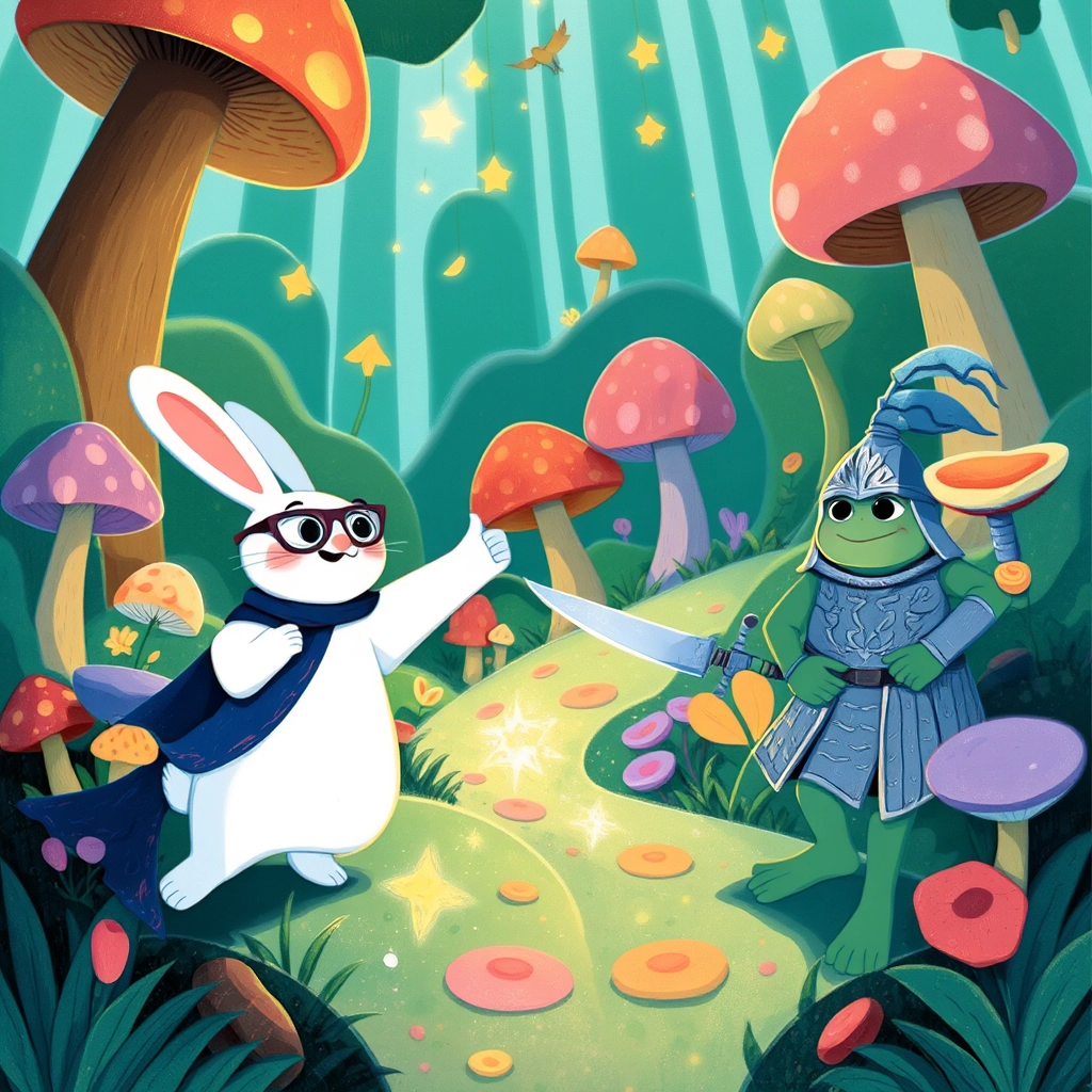 As she hopped down the path, [Fluffy](53SZPMZJ) met [Sir Ribbit](TDVQJSJQ), a knightly frog wearing a tiny suit of armor. He waved his lilypad shield and greeted her cheerfully.