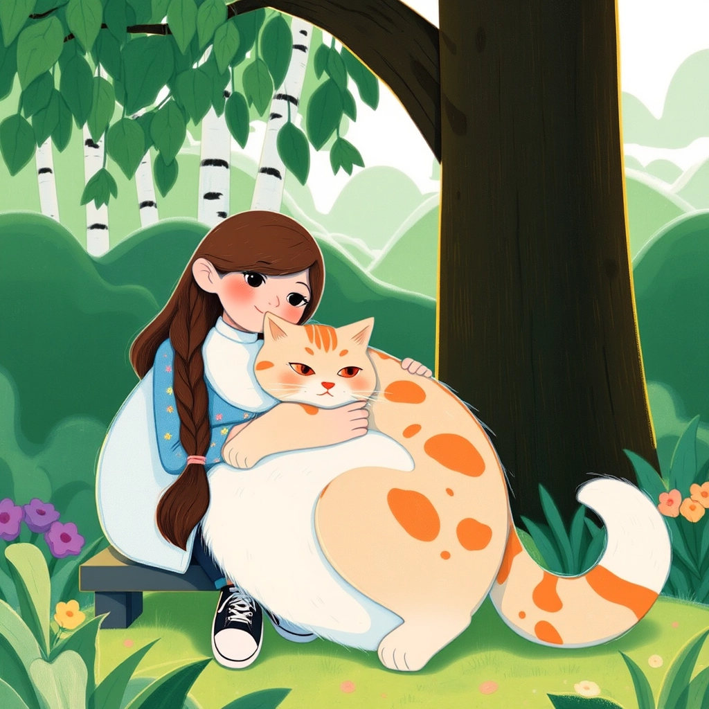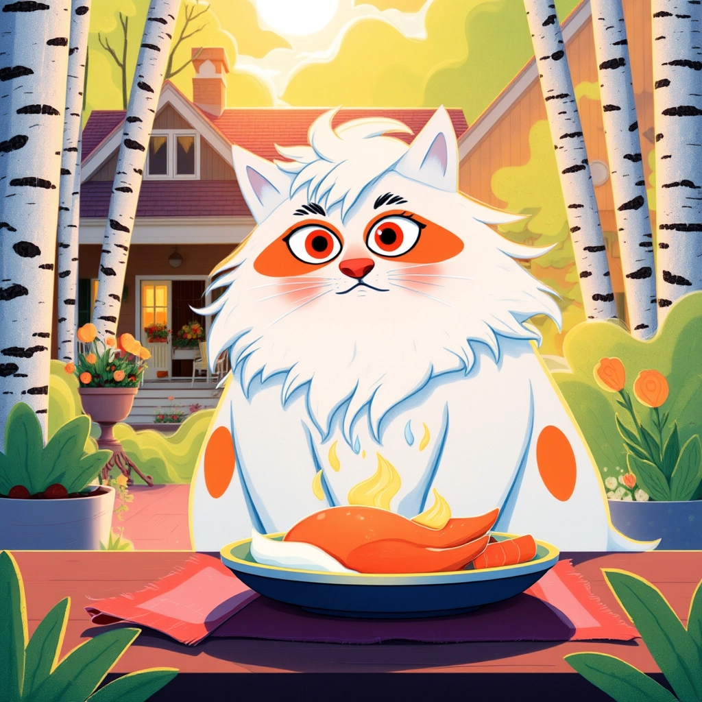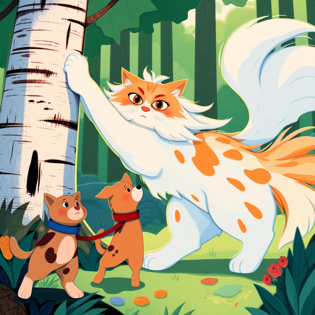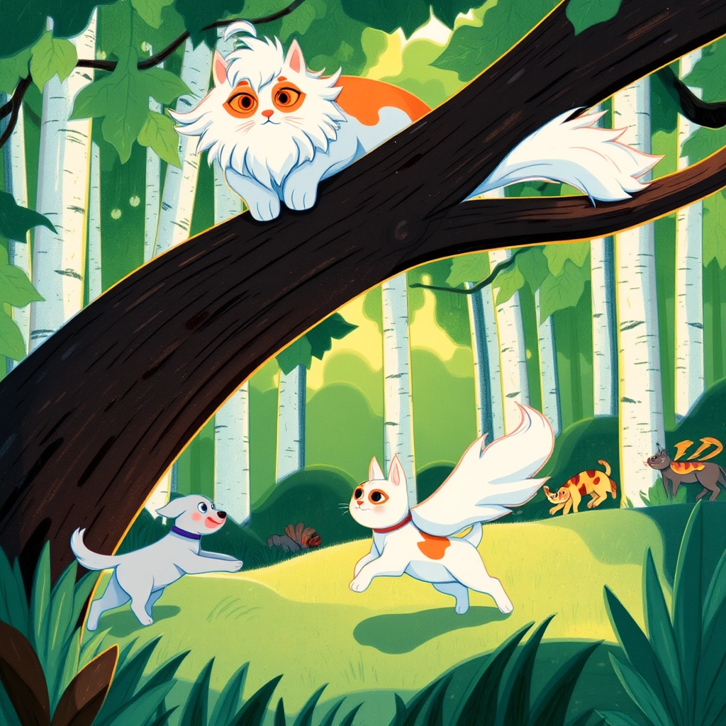 On Birch Lane, a majestic wide-eyed cat named [Fluffywuffy](3H3HDGS6) surveyed his domain from atop a tall birch tree. With his fluffy white coat and bright orange tabby markings, he looked like a king guarding his kingdom.