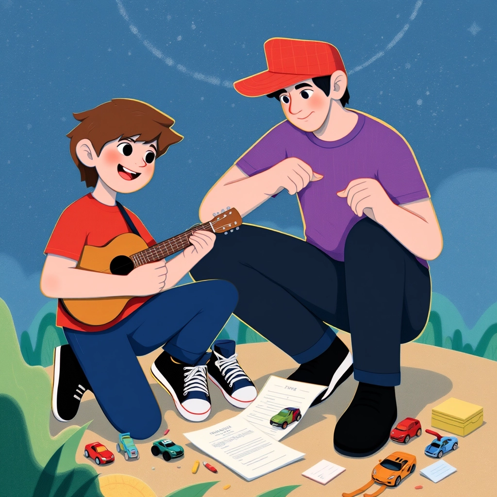 [Daniel](6KW49ZY5), a music lover, brought his guitar to play a new song he had learned. [Tom](K6J9SNPX) couldn’t wait to show off the latest tiny car model he had built.