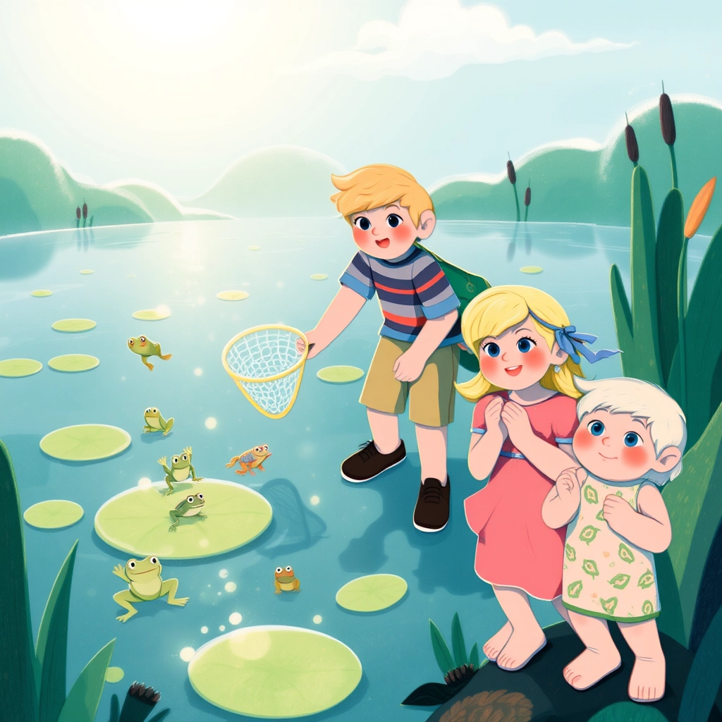 At last, they arrived at the sparkling pond! It was surrounded by cattails and lily pads, and the water rippled with tiny splashes. "Look, frogs!" [Lily](ZDJRR9DC) shouted.