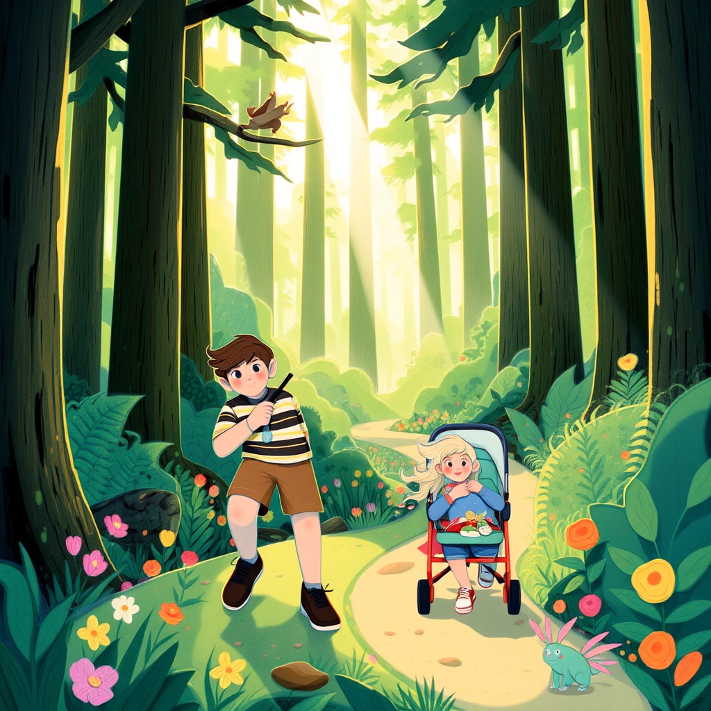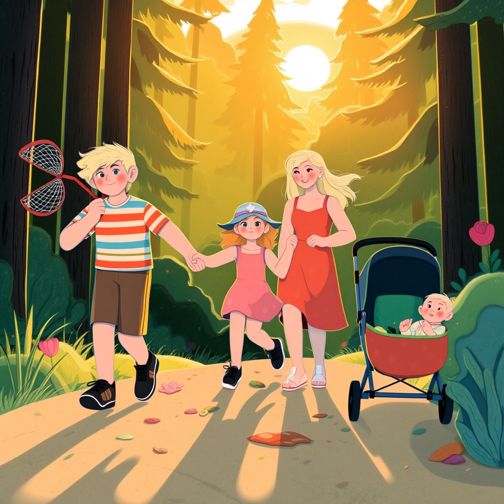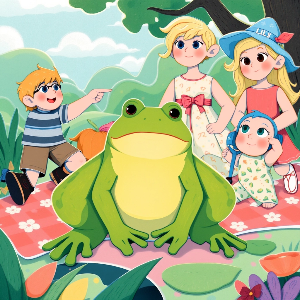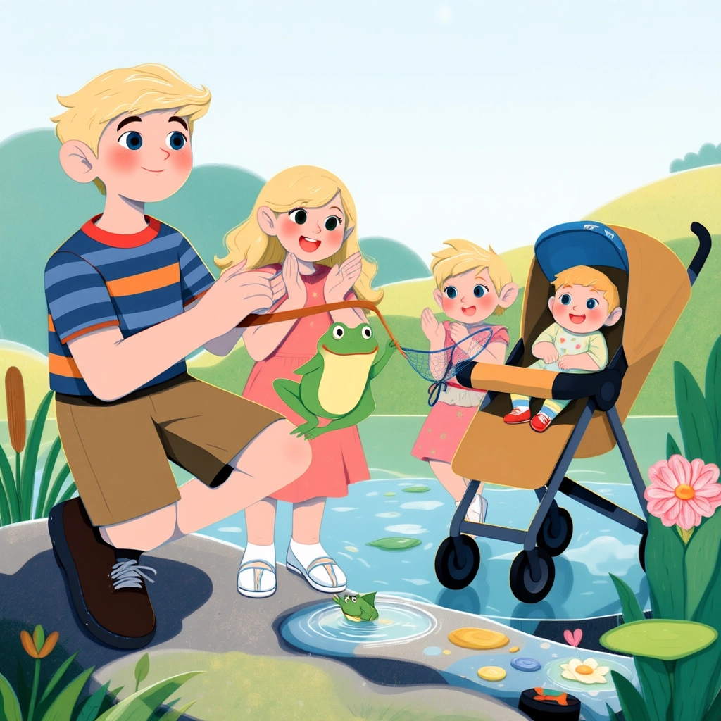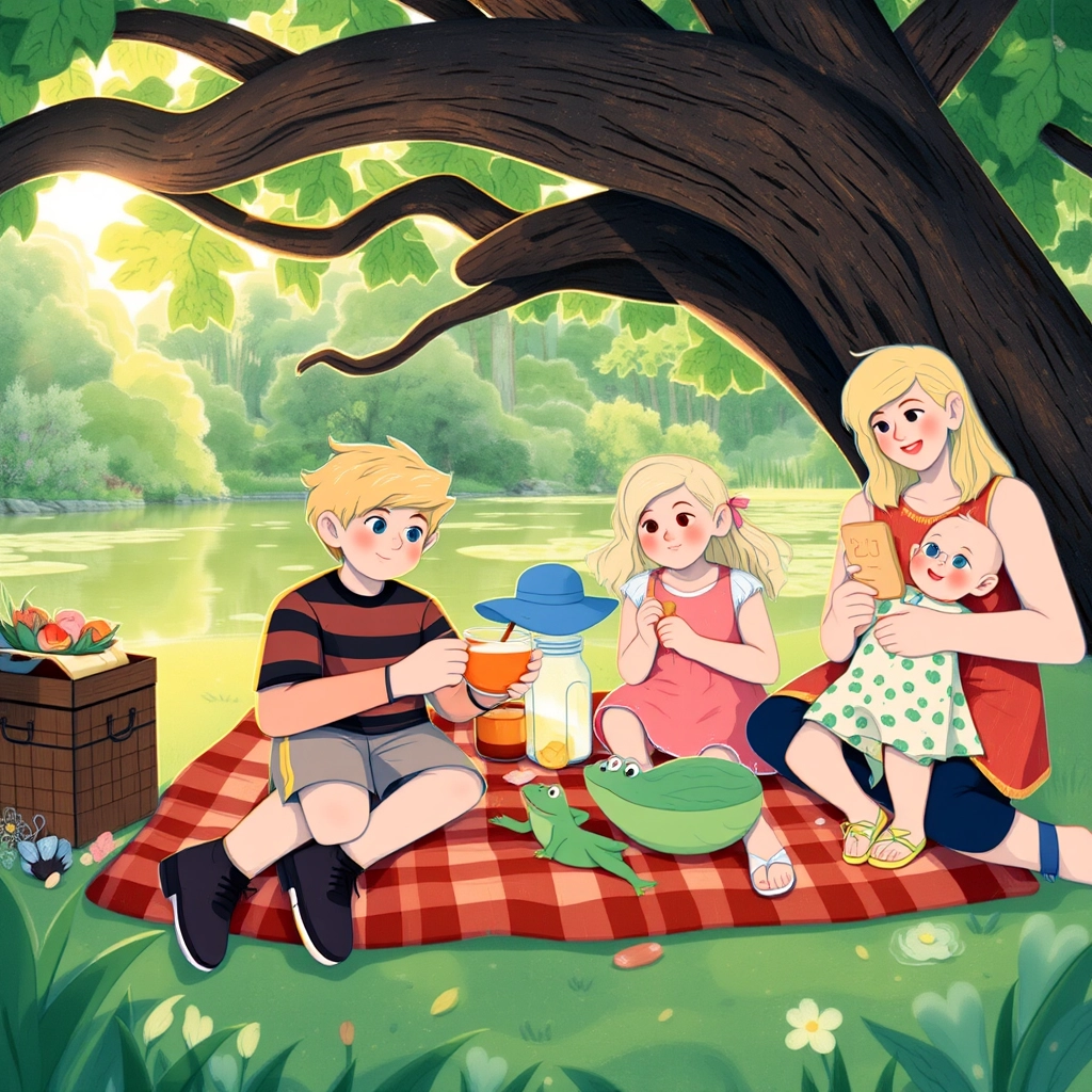One sunny morning, [Henry](YT2MWV2R), [Lily](ZDJRR9DC), baby [Max](ZYDM7Z6G), and their mom packed up their picnic basket and frog nets, ready for an adventure. They were off to the big pond in the magical woods near their house!