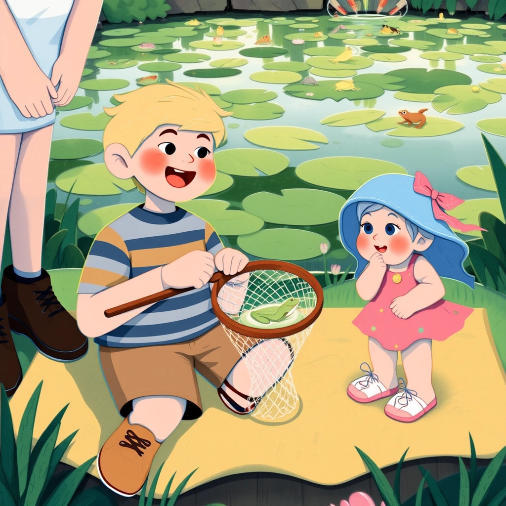 [Henry](YT2MWV2R) gently scooped his net into the water. He waited patiently, then lifted it triumphantly. "I caught one!" he exclaimed. The frog croaked loudly, making everyone laugh.