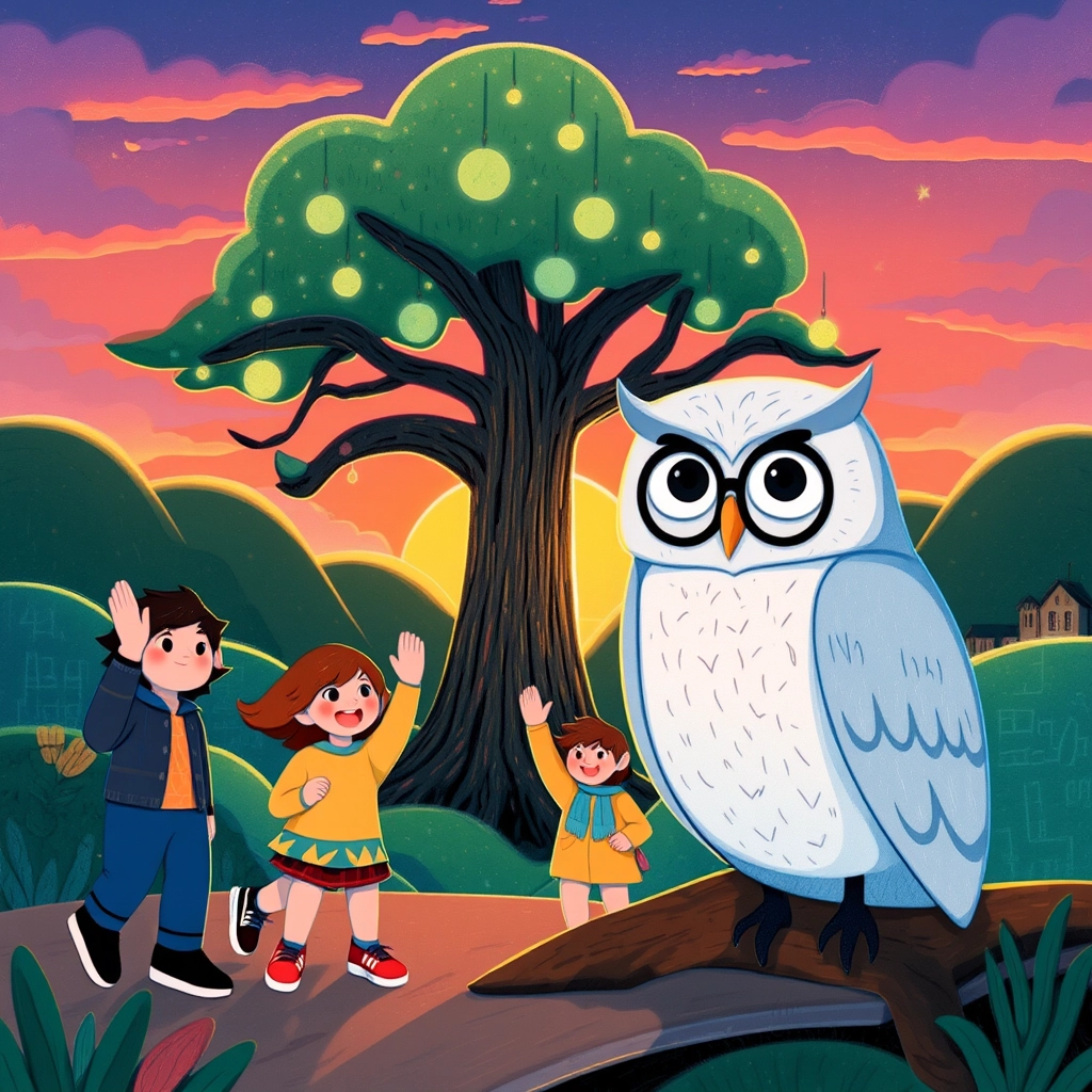 As the sun set, the Math Tree began to dim. 'You’ve all learned so much today!' said [Dr. Owl](LNBBKBJC). 'Tomorrow, we’ll skip count and discover more!' The friends cheered in excitement.