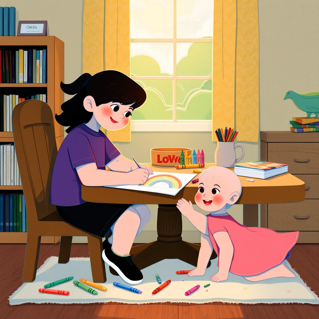 One morning, [Ofelia](GVTZ4G3H) was drawing with her crayons. [Ingrid](DK39PDS9) came crawling over with a big smile. She wanted to draw too!