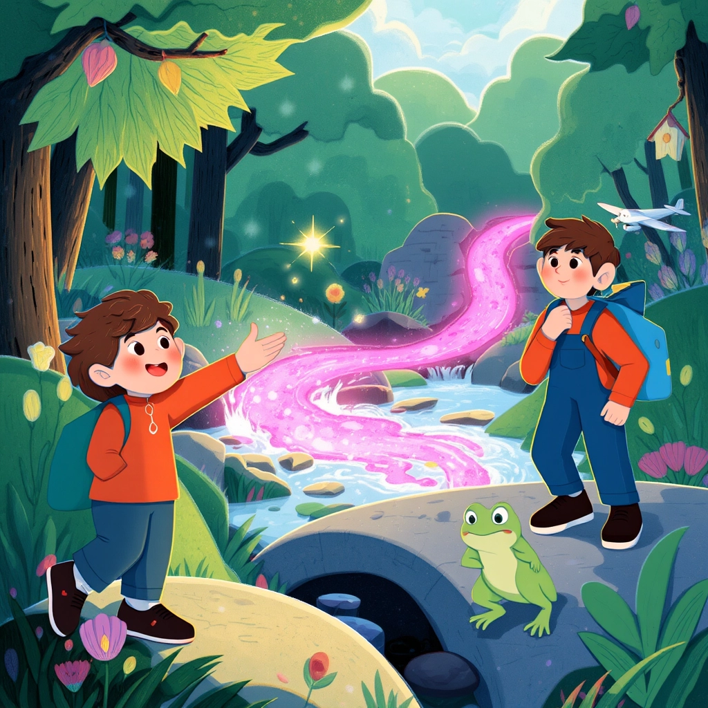 They came to a bubbling brook where they met Sam the Splashing Frog, who had green, bumpy skin and big, round eyes.