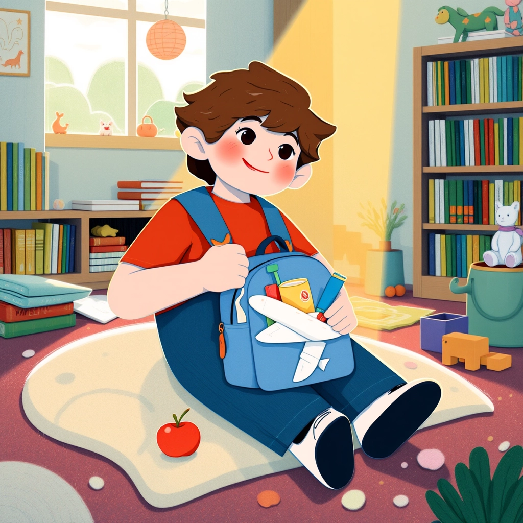 He packed his little blue backpack with his favorite snacks, a shiny red apple, and his trusty toy airplane.