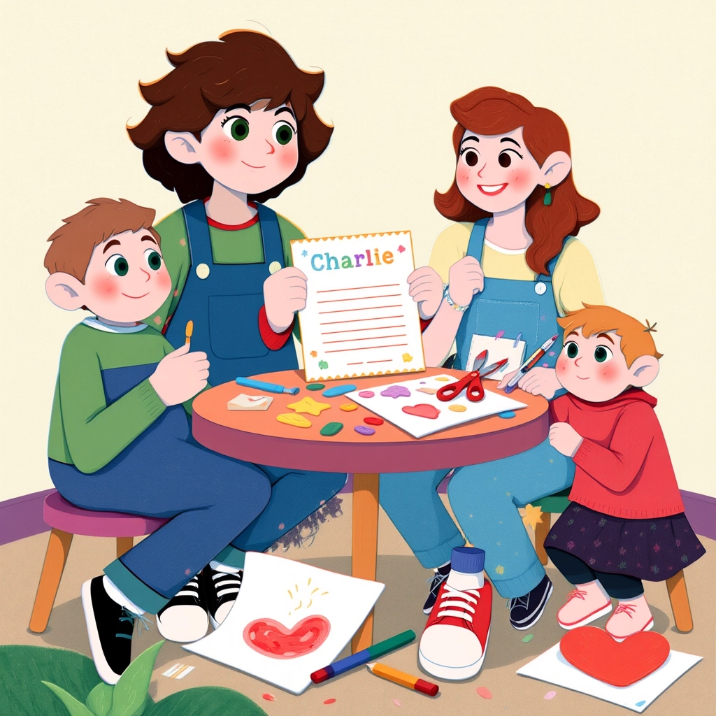 With the table ready, [Charlie](F4HWC2S9) decided to make some handmade party invitations. Everyone sat around the craft table, cutting shapes, coloring cards, and drawing funny pictures.