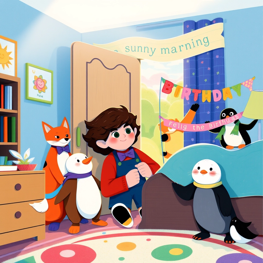 Today was a big day! [Charlie](F4HWC2S9) woke up feeling excited because it was their birthday party. They hurried to get started on the decorations with their friends: [Felix the Fox](FHDQLHYZ), [Penny the Penguin](YQCRFWFP), and [Ruby the Rabbit](MMMX9DVL).