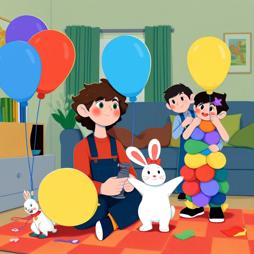 First, they decided to blow up balloons. Ruby, being the fastest, helped [Charlie](F4HWC2S9) tie the knots, while Felix stacked the balloons carefully into big, colorful bunches.