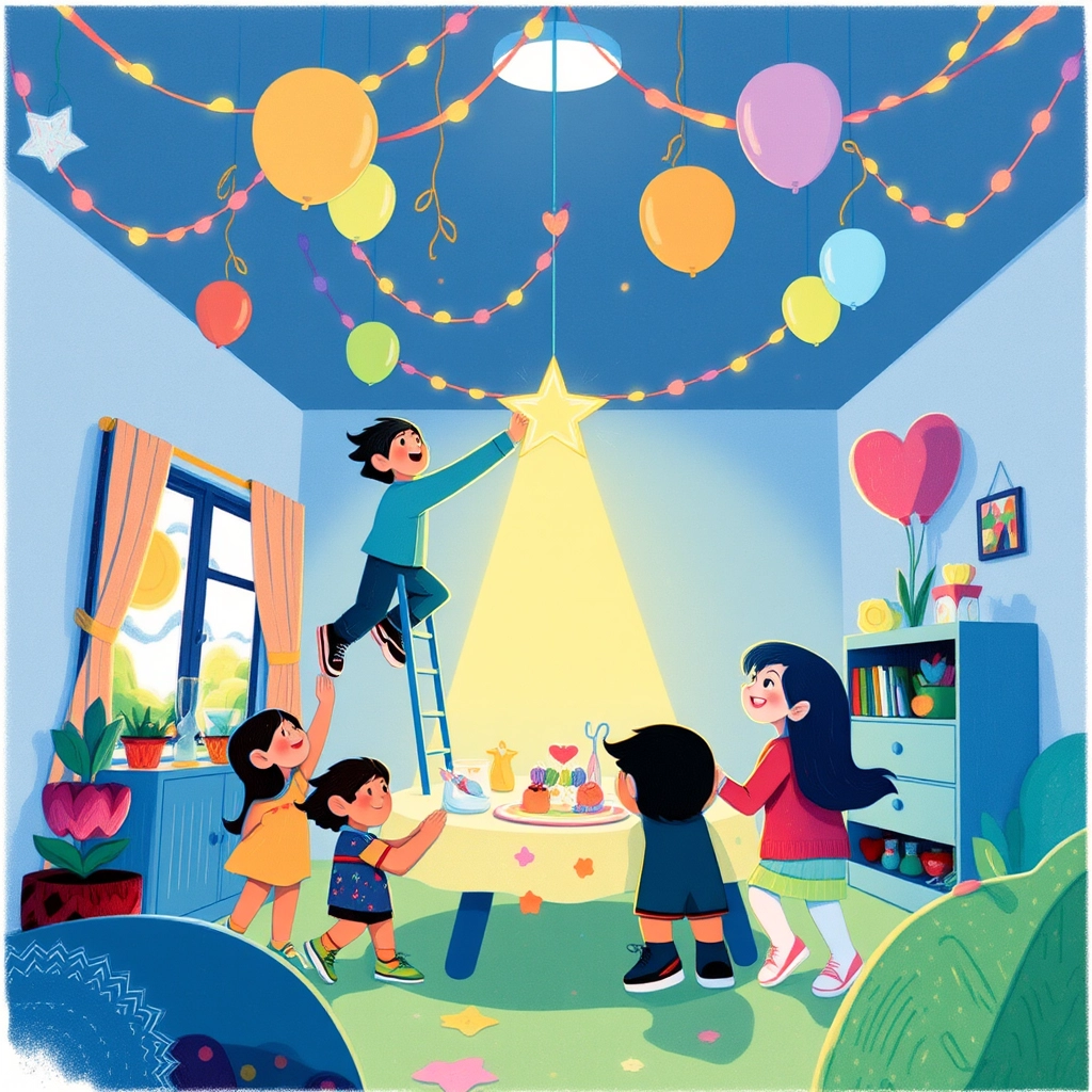 Finally, the decorations were finished, and the room looked magical! Felix added the final touch: a shiny, golden star at the top of the decorations.